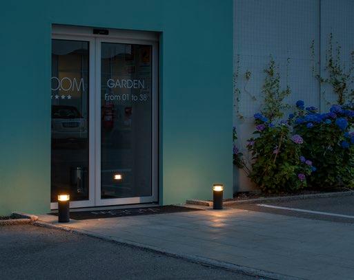 Også den indirekte strålende ARROCK STONE drar nytte av det naturlige materialet. Med sitt gjennomtenkte design gir den firkantete pullerten et stemningsfullt lys som blir reflektert fra bakken.