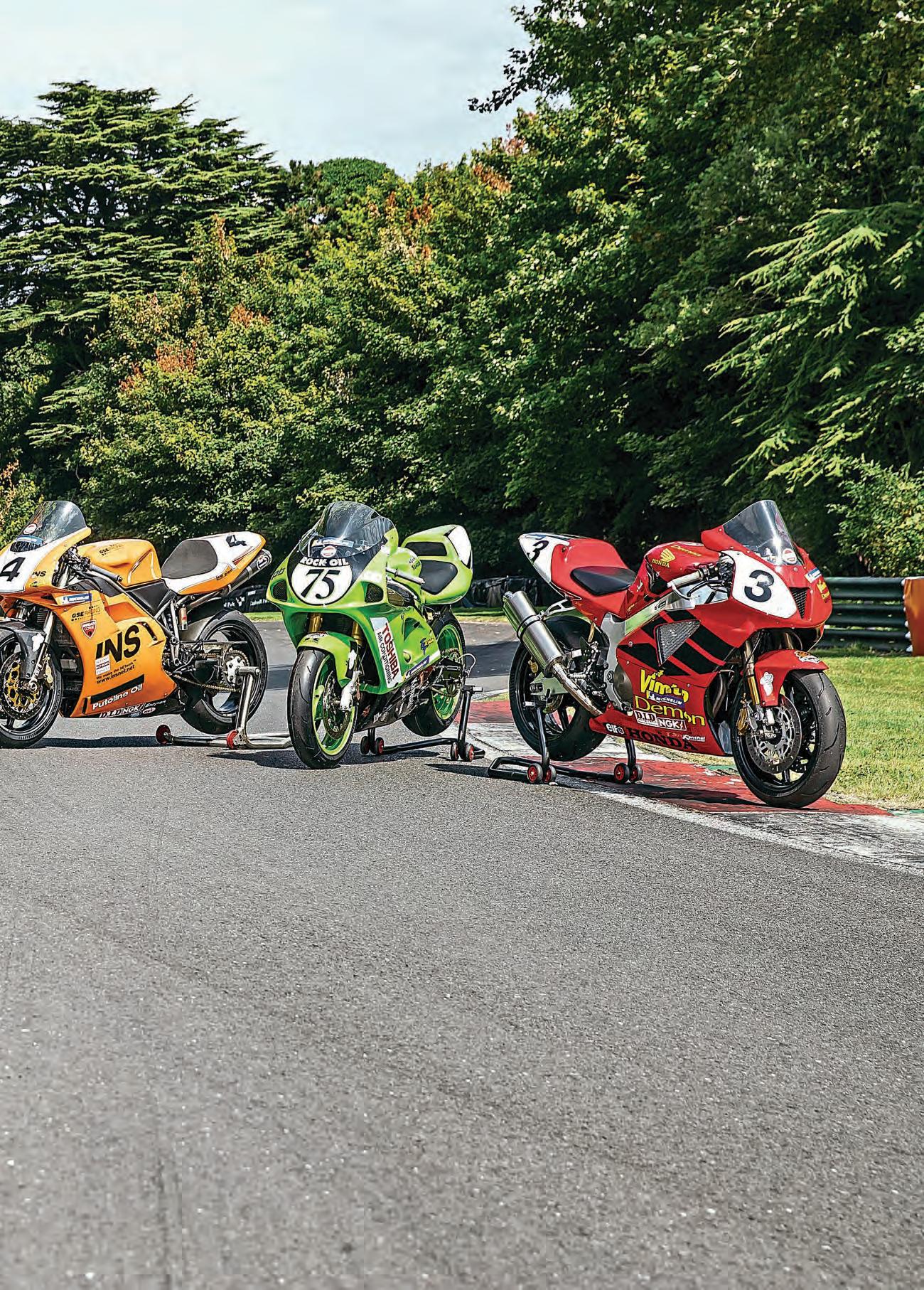 We teamedup with ourfriendsat Renaissance Racing,whoareacutely aware of thesoftspotmanyofusholdforthese bikes and thateraofracing.Theyhave assembled afeetof them foroldfolklikeme totaketripsdownmemorylaneand youngsterslikeBruceandTimtoglimpsethe pastandseewhatallthefussisabout.The bikes are, infact, well-preparedstandard road bikesandnot the actual racebikes they mimic,whichis agood thing–andnotonly because the sheercostofgettingall fve factory bikes togetherandrunningthem would be impossible to justify.Instead,using somebeautifullyprepared roadbikes witha sprinkling atrick bits wearingtribute bodyworkmeansthatwhat youhavehere areroadbikes decked outin theirmosticonic racecoloursfor atruly uniquegrouptest, whichitselfprobablyhasn’tbeendonefor 20 years–certainlynoton track.