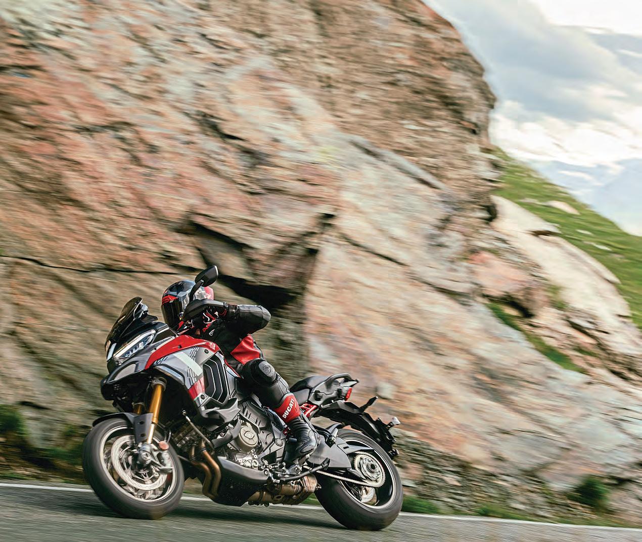 Thegearbox issmooth,andsmalldetails likehow shortandpositivethethrow isonthe gear lever, whichmakes swoppingcogsa reallysnappyprocess, addtothe modernfeel. Itstillneeds aspaced-outapproachto downshifting,butthankstothefexibilityand responsiveness of the engine,you neverneed togotofrstgearbecausethemotorcanpull secondgearofftheslowercorners. Beingable tonotuse frstgearmakes amassive differencetohowmuch youcan reallyattack thefnal part of thebrakingphase/turnintoa corner.Itmeansyou cantrailbrakewith much moreconfdence,knowingthat youdon’thave todropitintofrstgearandinviteunwanted hoppingorlockingfromthe rearwheel. It’sagreat exampleofhowthepositive effecton corner exitcanalsohave theadded sideeffectofsmoothingoutthecornerentry. Ofcourse,thesesortofspin-offbeneftsdon’t
