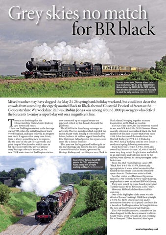 Black theme’, bringing together as many locomotives in BR black as possible. The star of the show, the one everyone wanted to see, was WR 4-6-0 No. 7820 Dinmore Manor, recently reliveried into unlined black, the first member of the class to carry that livery since 1959. It has borrowed the tender from the Bluebell Railway’s GWR 4-4-0 Dukedog No. 9017 Earl of Berkeley until its own tender is ready next spring following restoration. Then there was GWR 4-6-0 No. 3850, also owned by Dinmore Manor Ltd, which headed some very long mixed freight trains, and which, in an impressive and welcome move by the railway, were allowed to carry passengers in the brake vans. From the Mid-Hants Railway came LMS ‘Black Five’ 4-6-0 No. 45379, historically appropriate as it was a sister locomotive that hauled the last steam train on the Stratfordupon-Avon to Cheltenham route in 1966. Another visitor was Hawksworth pannier tank No. 1501 from the Severn Valley Railway, resplendent as ever in its lined BR black livery. They were joined by home-based repatriated Turkish Stanier 8F in BR livery as No. 48274. However, BR black did not have it all its own way. One of the highlights of the event was the debut of Jeremy Hosking’s GWR heavy freight 2-8-0T No. 4270, which has been under restoration from Barry scrapyard condition for a decade at Toddington since he bought it from the now-defunct Swansea Vale Railway. The 1919-built locomotive, a member of the class designed for the heavy mineral traffic in South Wales, spent virtually all of its working life at Newport (Ebbw Junction) shed apart