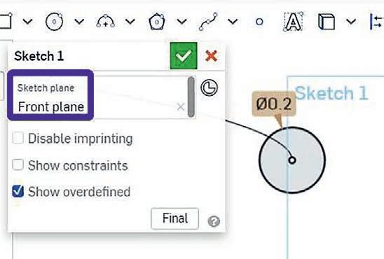 – Create a sketch on the Front plane This plane will contain the starting point of the helix Draw a circumference of 0 2mm diameter – 56