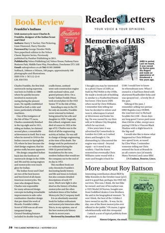 More about Roy Battson Interesting contribution about RKB by Mike Knowles in the October issue (p12) and it is good that, perhaps, his 1959 AJS survives. This was, I think, the last bike he owned, and one of his earliest was a 1925 Model 18 Norton, bought new from Guildford dealers Crow Brothers. He said in his biographical memoir: “It was I think, the best of the 14 bikes I have owned in my life... It was, for its day, one of the finest motorcycles ever offered to the public.” Of course, I agree wholeheartedly with this viewpoint! I attach a scan of typical publicity from the period. Simon Grigson, via email.