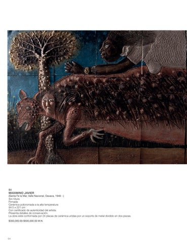 Firmada Cerámica policromada a la alta temperatura 84.5 x 221 cm Con certificado de autenticidad del artista. Presenta detalles de conservación. La obra está conformada por 24 placas de cerámica unidas por un soporte de metal dividido en dos piezas. $350,000.00-$500,000.00 M.N.