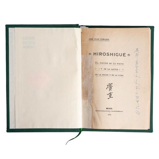 Tablada, José Juan. Hiroshigue el Pintor de la Nieve y de la Lluvia, de la Noche y de la Luna. México: Monografías Japonesas, 1914. 8o. marquilla, XIII + 119 + VI p. + 1 h. Primera edición. Ilustrado. Portada deteriorada, restaurada. Encuadernado en pasta dura.