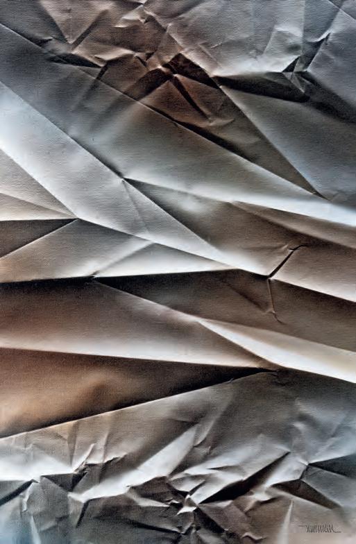 Las esculturas de Aldo Chaparro hechas con acero doblado son el resultado de una cercana relación con el material. Este elemento ha estado presente en la humanidad desde la antigüedad, sin embargo, las hojas de acero utilizadas por Chaparro son características de la era industrial. Su delgadez, pulcritud y calidad reflejante solo se pueden lograr con el uso de maquinaria, debido a eso, la naturaleza violenta de las esculturas crea un contraste con el estado original de estas hojas, ya que Chaparro las patea, dobla y salta sobre ellas usando nada más que su cuerpo y su propio peso. Los objetos resultantes de su confrontación con el material son evidencia, perpetuan el proceso que transformó el material en un objeto artístico. De esta manera, sus hojas de acero arrugadas pueden interpretarse como autorretratos, ya que capturan la energía liberada por Chaparro en una fecha y hora específicas.