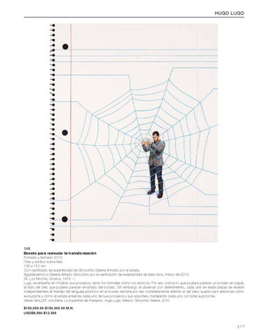 148 Boceto para reanudar la transformación Firmado y fechado 2012. Óleo y acrílico sobre tela. 130 x 110 cm Con certificado de autenticidad de Ginocchio Galería firmado por el artista. Agradecemos a Galería Alfredo Ginocchio por la verificación de autenticidad de esta obra, marzo de 2013. (N. Los Mochis, Sinaloa, 1974 - ) Lugo se empeña en mostrar sus procesos, tanto los formales como los teóricos. Por eso coloca lo que pudiera parecer un boceto en papel, al lado del óleo que pudiera parecer emanado del boceto. Sin embargo al observar con detenimiento, cada una de estas piezas se revelan independientes; el manejo del lenguaje pictórico en el boceto termina por ser completamente distinto al del óleo; queda claro entonces cómo evoluciona y cómo el artista entiende cada uno de sus procesos y sus soportes, manejando cada uno con total autonomía. Véase: MALLET, Ana Elena. La Superficie del Precipicio. Hugo Lugo. México. Ginocchio Galería, 2010.