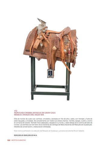 152 MONTURA CHARRA ANTIGUA DE GRAN GALA MÉXICO, FINALES DEL SIGLO XIX Silla de montar de cuero con cantinas, cincelada y bordada en hilo de pita y plata, con herrajes y fuste de plata repujada y cincelada. Se complementa con todos sus arreos charros: mantilla, sarape, cuarta y cincho en armonía de colores. También lleva cabezada y espada en su funda, y reata debajo de la cantina del lado de montar. Los estribos son de hierro de la hacienda de Ciénega de Mata (hacienda del Marqués de Guadalupe). Detalles de conservación y restauración (retobada). Esta montura perteneció a la colección del Marqués de Guadalupe y proviene de la familia Rincón Gallardo.