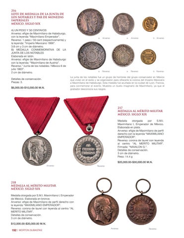 216 LOTE DE MEDALLA DE LA JUNTA DE LOS NOTABLES Y PAR DE MONEDAS IMPERIALES MÉXICO, SIGLO XIX A) UN PESO Y 50 CENTAVOS Anverso: efigie de Maximiliano de Habsburgo, con la leyenda “Maximiliano Emperador”. Reverso: 1 peso / 50 cent (respectivamente) y la leyenda: “Imperio Mexicano 1866”. 3.8 cm y 3 cm de diámetro. B) MEDALLA CONMEMORATIVA DE LA JUNTA DE LOS NOTABLES Elaborada en latón. Anverso: efigie de Maximiliano de Habsburgo con la leyenda: “Maximiliano de Austria”. Reverso: “Junta de los notables / México 6 de julio 1863”. 2 cm de diámetro.