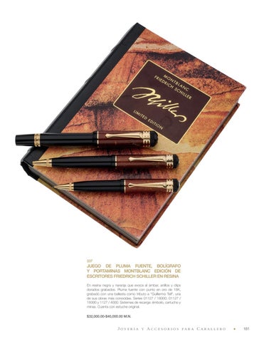 JUEGO DE PLUMA FUENTE, BOLÍGRAFO Y PORTAMINAS MONTBLANC EDICIÓN DE ESCRITORES FRIEDRICH SCHILLER EN RESINA En resina negra y naranja que evoca al ámbar, anillos y clips dorados grabados. Pluma fuente con punto en oro de 18K, grabado con una ballesta como tributo a “Guillermo Tell”, una de sus obras más conocidas. Series 01127 / 18000, 01127 / 16000 y 1127 / 4000. Sistemas de recarga: émbolo, cartucho y minas. Cuenta con estuche original. $32,000.00-$40,000.00 M.N.