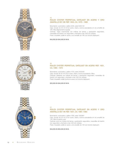 ROLEX OYSTER PERPETUAL DATEJUST EN ACERO REF. 1601, CA. 1969 - 1970 Movimiento: automático, calibre 1570, serie 2420330 Caja: circular de 35 mm Ø en acero, bisel y corona acanalados. Mica. Carátula: plateada con índices de barras y graduación segundera, manecillas de bastón con segundero y fechador a las 3:00 con cíclope. Pulso: brazalete Jubilé (corto) en acero con broche deployant. $32,000.00-$40,000.00 M.N.