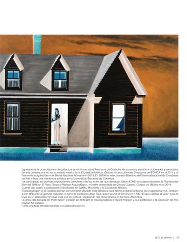Egresado de la Licenciatura en Arquitectura por la Universidad Autónoma de Coahuila. Ha cursado y asistido a diplomados y seminarios de arte contemporáneo en su estado natal y en la Ciudad de México. Obtuvo la beca Jóvenes Creadores del FONCA en el 2011 y el Premio de Adquisición en la Bienal Nacional Nómada en 2013. En 2019 fue seleccionado Miembro del Sistema Nacional de Creadores de Arte e hizo una residencia artística en la Universidad Nacional de Colombia. Ha participado en diversas exposiciones colectivas y ferias, entre las que destacan Salón ACME en cuatro ediciones, la Transborder Biennial 2018 en El Paso, Texas y Plástico Arqueológico, muestra presentada en Círculo Cubano, Ciudad de México en el 2019. Cuenta con cuatro exposiciones individuales en Saltillo, Monterrey y la Ciudad de México. "Doppelgänger" es el vocablo alemán comúnmente utilizado en la literatura para definir al doble fantasma de una persona viva. También suele atribuirse al gemelo malvado, o como lo escribiera Jean Paul, quien acuñó el término en 1796: "El que camina al lado". Aquí la línea es un elemento principal, esta vez en vertical, separando dos dimensiones en tiempos diferentes. La obra está basada en "High Noon", pintado en 1949 por el estadounidense Edward Hopper y que pertenece a la colección de The Dayton Art Institute. Fuente consultada: sitio oficial del artista www.carlosvielma.com.mx
