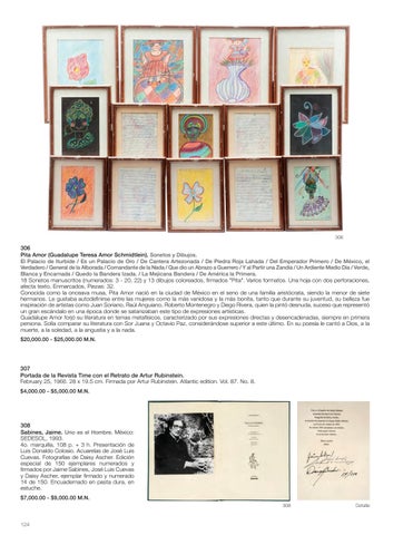 El Palacio de Iturbide / Es un Palacio de Oro / De Cantera Artezonada / De Piedra Roja Lahada / Del Emperador Primero / De México, el Verdadero / General de la Alborada / Comandante de la Nada / Que dio un Abrazo a Guerrero / Y al Partir una Zandía / Un Ardiente Medio Día / Verde, Blanca y Encarnada / Quedo la Bandera Izada. / La Mejicana Bandera / De América la Primera. 18 Sonetos manuscritos (numerados: 3 - 20, 22) y 13 dibujos coloreados, firmados "Pita". Varios formatos. Una hoja con dos perforaciones, afecta texto. Enmarcados. Piezas: 32. Conocida como la onceava musa, Pita Amor nació en la ciudad de México en el seno de una familia aristócrata, siendo la menor de siete hermanos. Le gustaba autodefinirse entre las mujeres como la más vanidosa y la más bonita, tanto que durante su juventud, su belleza fue inspiración de artistas como Juan Soriano, Raúl Anguiano, Roberto Montenegro y Diego Rivera, quien la pintó desnuda, suceso que representó un gran escándalo en una época donde se satanizaban este tipo de expresiones artísticas. Guadalupe Amor forjó su literatura en temas metafísicos, caracterizado por sus expresiones directas y desencadenadas, siempre en primera persona. Solía comparar su literatura con Sor Juana y Octavio Paz, considerándose superior a este último. En su poesía le cantó a Dios, a la muerte, a la soledad, a la angustia y a la nada. $20,000.00 - $25,000.00 M.N.