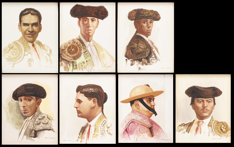 También se incorporan obras marcadas con el sello de lo trágico –representaciones de corridas de toros–como los lienzos del maestro Carlos Ruano Llopis, que presentan lances, pases y suertes del modo más rítmico posible (lote 90 y 99), o las excepcionales interpretaciones de los pliegues románticos del capote o el manejo con suavidad de la muleta de toreros como Eloy Cavazos o “Armilla” realizadas por Antonio Navarrete (74) y Francisco “Pancho” Flores (65). Seguidas de los rostros de toreros inmortalizados en óleo por Luis Solleiro (lote 126) y Gerardo Lizarraga (lote 134).