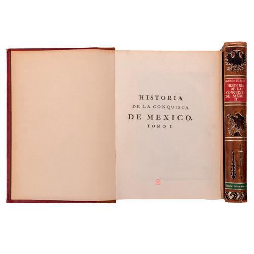 Solís, Antonio de. Historia de la Conquista de México. México: Editorial del Valle de México, 1972. arquilla, L + 489 p. + 4 h.; VIII + 460 p. + 2 h. Tomos I - II. Facsimilar de Jesús Medina. Encuadernados en pasta dura. Piezas: 2.