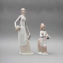 Decoradas con elementos vegetales, florales, orgánicos y uno con escena costumbrista Detalles de conservación y desportilladuras 22 cm de alto jarrones y 40 cm de longitud platón