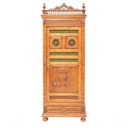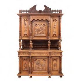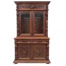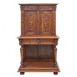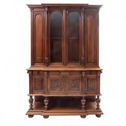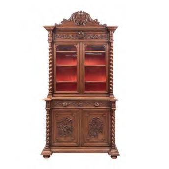 Con 2 puertas de vidrio, 2 cajones, 2 puertas inferiores y soportes tipo bollo Decorado con elementos musicales, mascarones, motivos frutales, orgánicos y vegetales