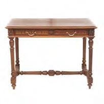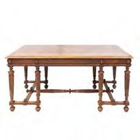 Cubierta rectangular, fustes a manera de jarrón, chambrana compuesta y soportes tipo bollo con ruedas Decorada con elementos arquitectónicos y molduras Detalles de conservación, marcas de uso y polilla 72 x 115 x 105 cm