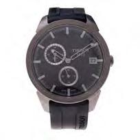 Caja circular en acero acabado color negro. Carátula color negro con índices de barras y números arábigos y dos subesferas.