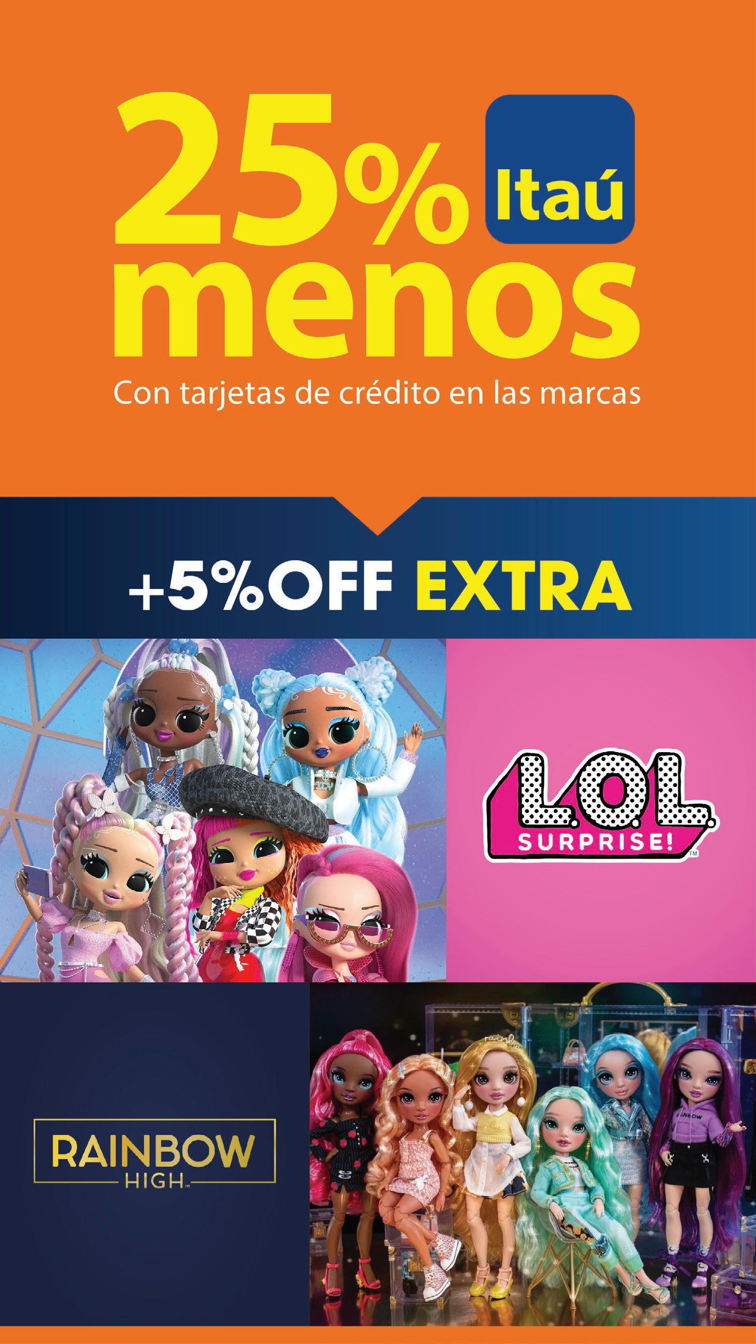 NUEVO * No disponible en todas las tiendas Toca sobre cualquier producto para comprar menos con tarjetas de crédito en artículos seleccionados *LOL SURPRISE TWEENS Con ropa, zapatos, accesorios para el pelo y mucho más $3.690 con Itaú $2.767 BARBIE COLOR REVEAL Ofrecen una experiencia llena de sorpresas al sacarlas de la caja! Al mojarlas veras un color diferente en cada una de ellas $1.990 con Itaú $1.493 CRY BABIES TUTTI FRUTI Muñeca perfumada interactiva $3.690 con Itaú $2.767 TIERNA MASCOTA EN CARTERA Para salir a pasear con ella $990 con Itaú $743 *LOL SURPRISE OMG QUEENS $3.490 con Itaú $2.618 NUEVO
