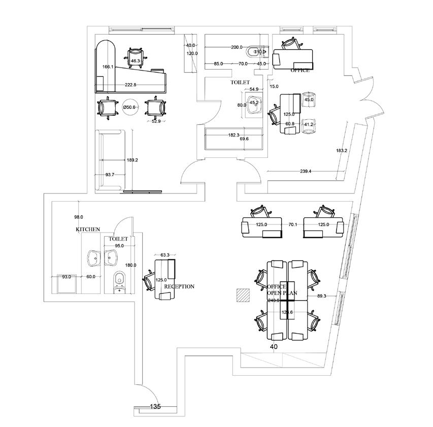 Ce projet concerne l’aménagement d’un espace de bureaux de 135 m², où l’optimisation de l’espace et le confort des utilisateurs sont au cœur de la conception. L’objectif est de créer un environnement fonctionnel, moderne et agréable, favorisant à la fois la concentration et les échanges professionnels.