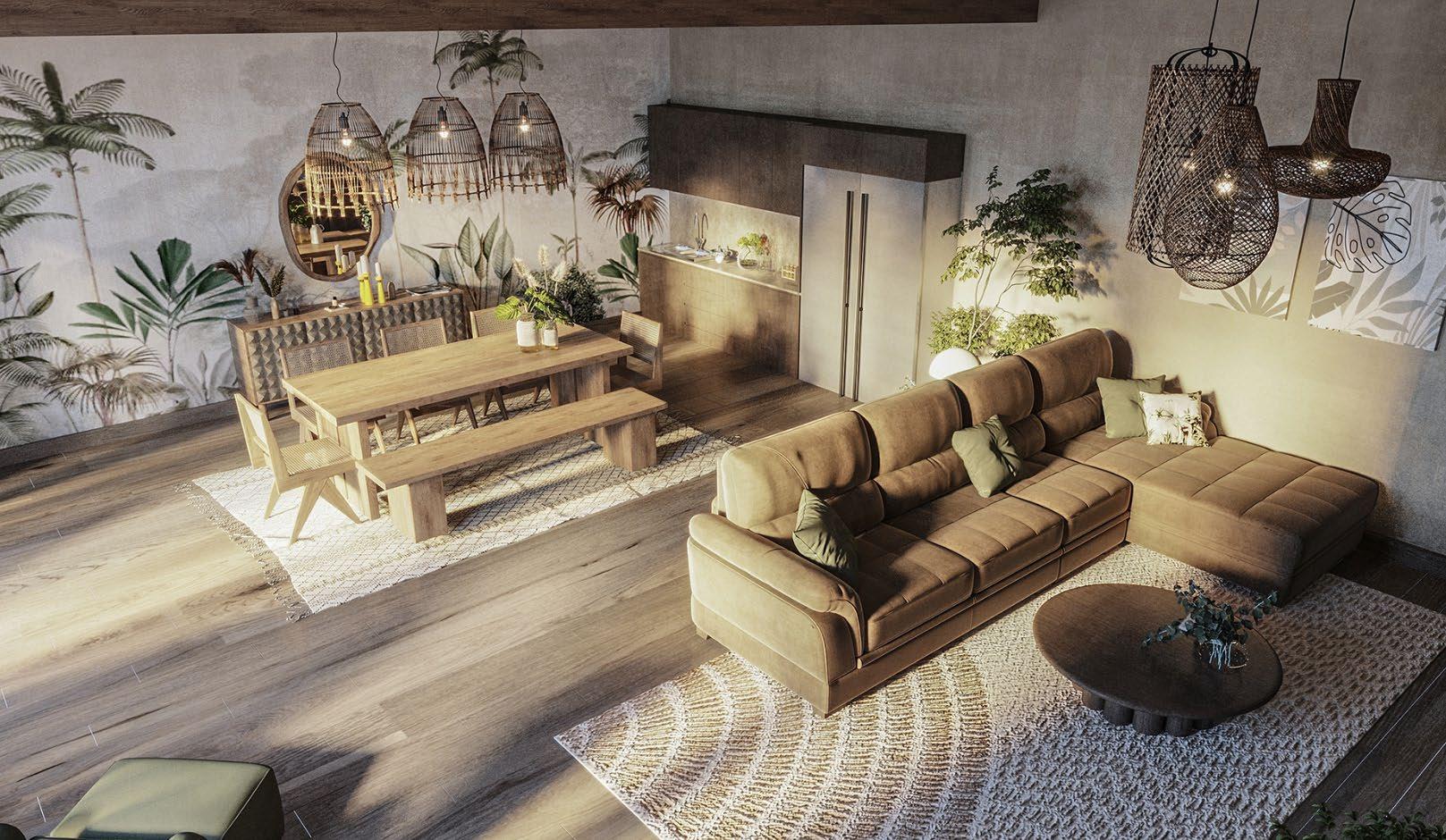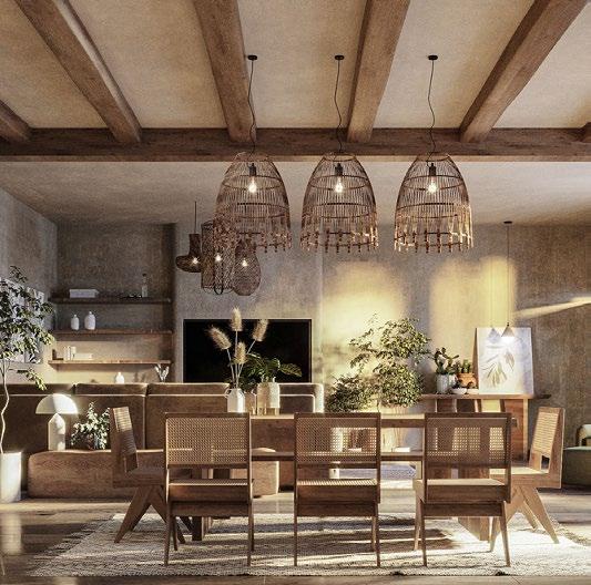 La combinaison des teintes neutres et terreuses évoque une atmosphère chaleureuse et intemporelle, où chaque élément contribue à une esthétique équilibrée et apaisante.