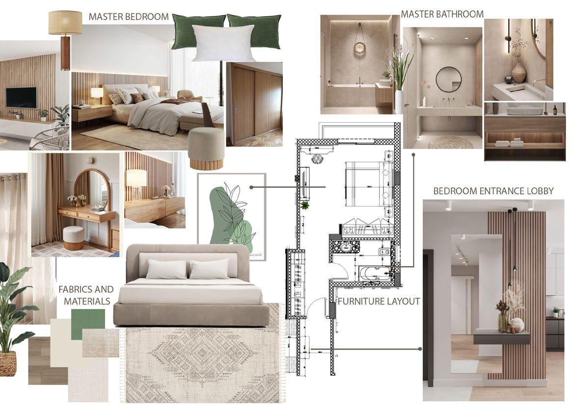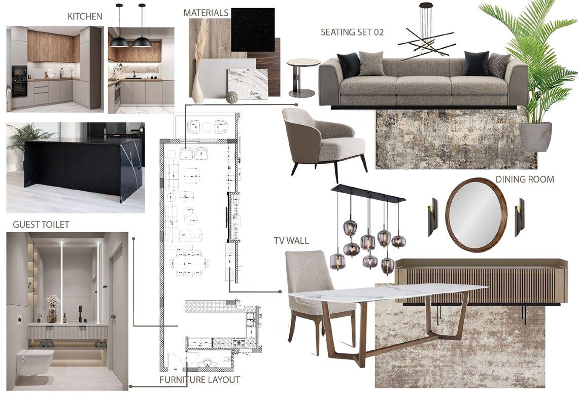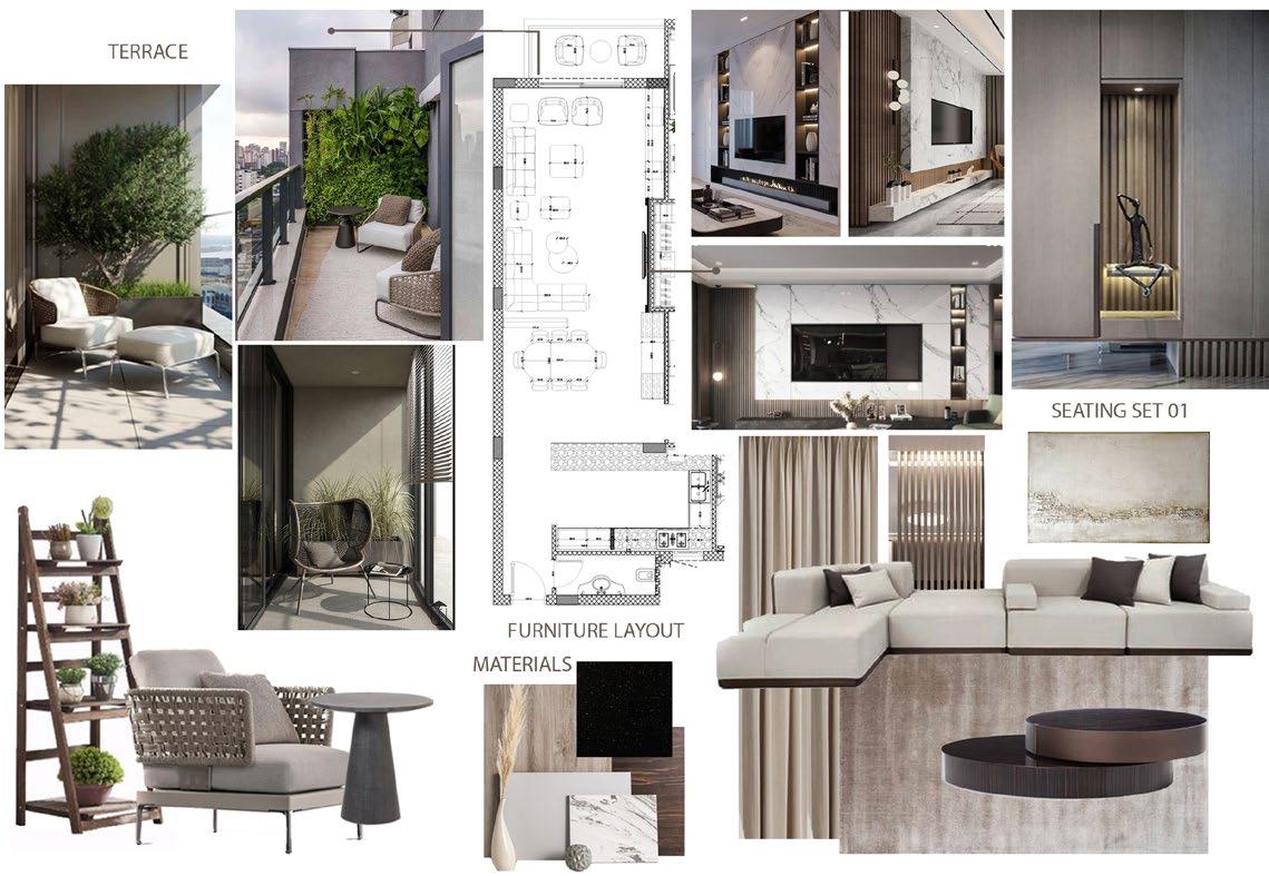 Ce moodboard reflète un design moderne et épuré, mettant en avant des espaces fonctionnels et équilibrés.