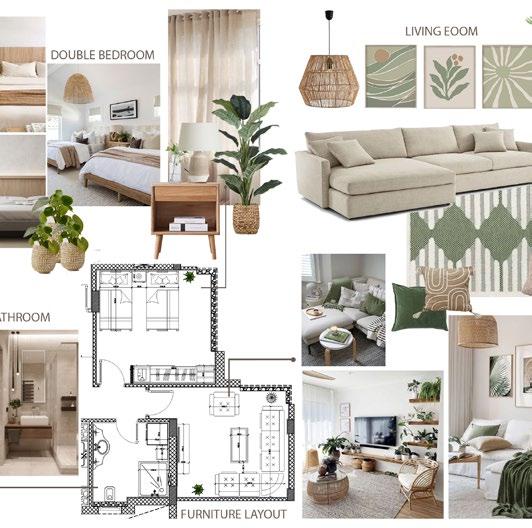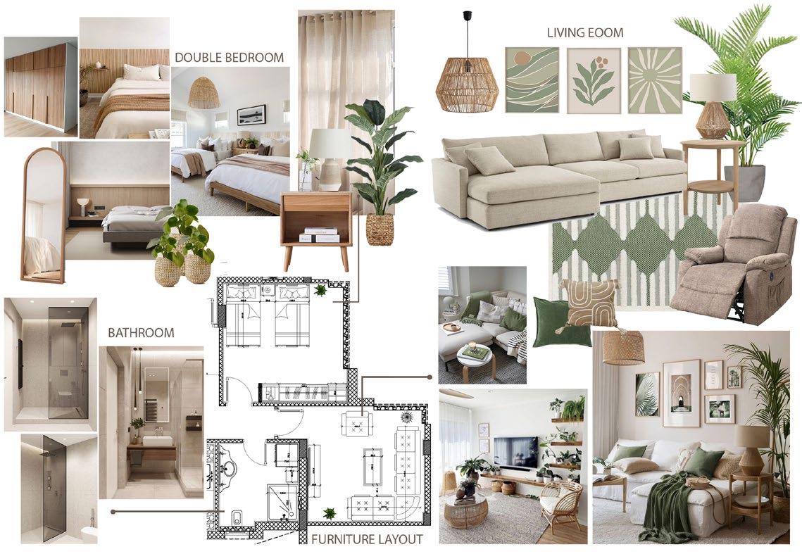 Inspiré par la nature, ce moodboard met en avant une palette organique et apaisante, où les nuances de vert doux et de beige se marient harmonieusement.