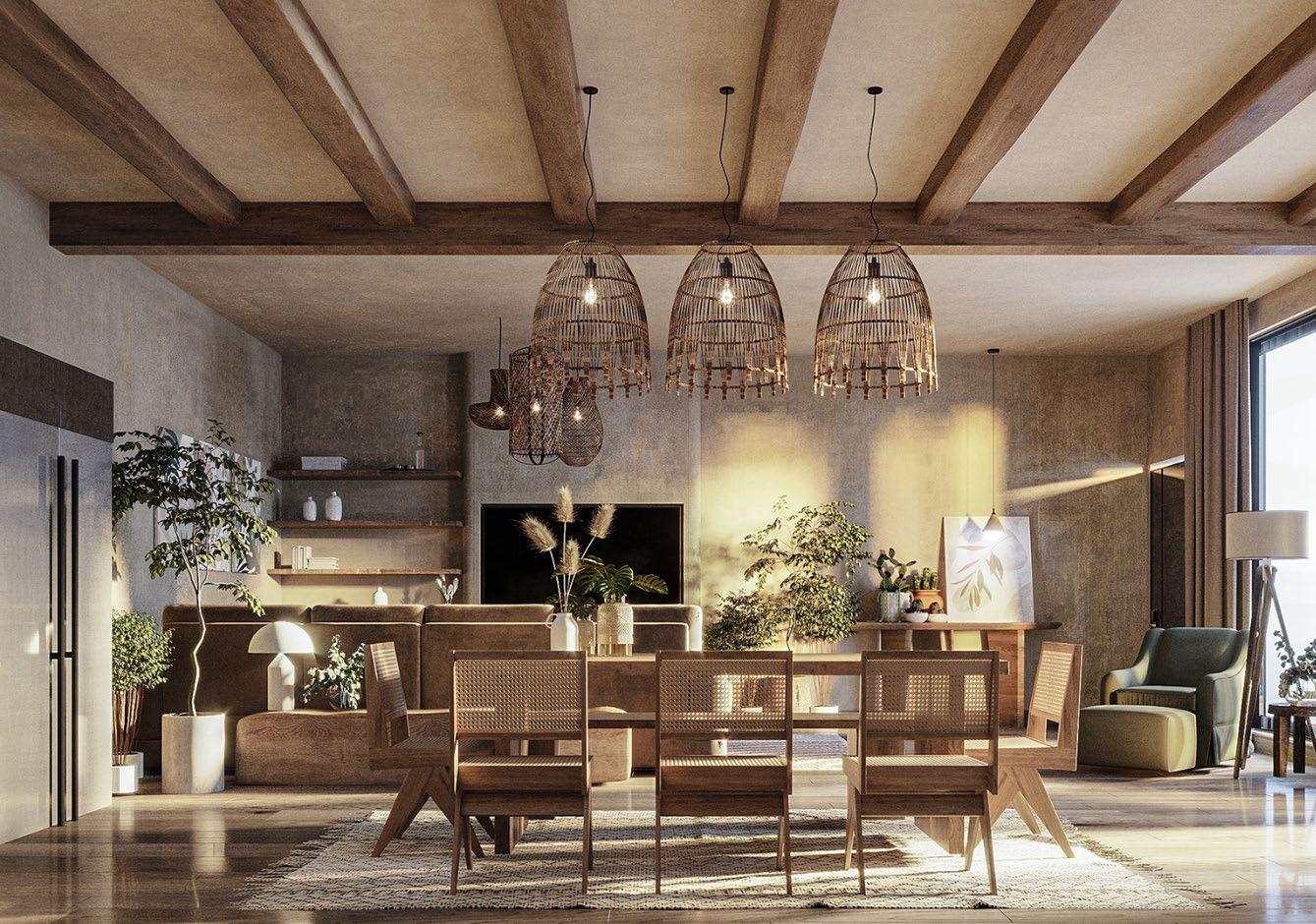 Le bois, élément central du design, apporte une touche d’authenticité et de convivialité. Il se décline à travers des meubles aux lignes épurées, des poutres apparentes et des finitions texturées qui subliment l’espace. La palette de couleurs, dominée par des tons marron, beige et gris, enveloppe chaque pièce d’une douceur naturelle et intemporelle.