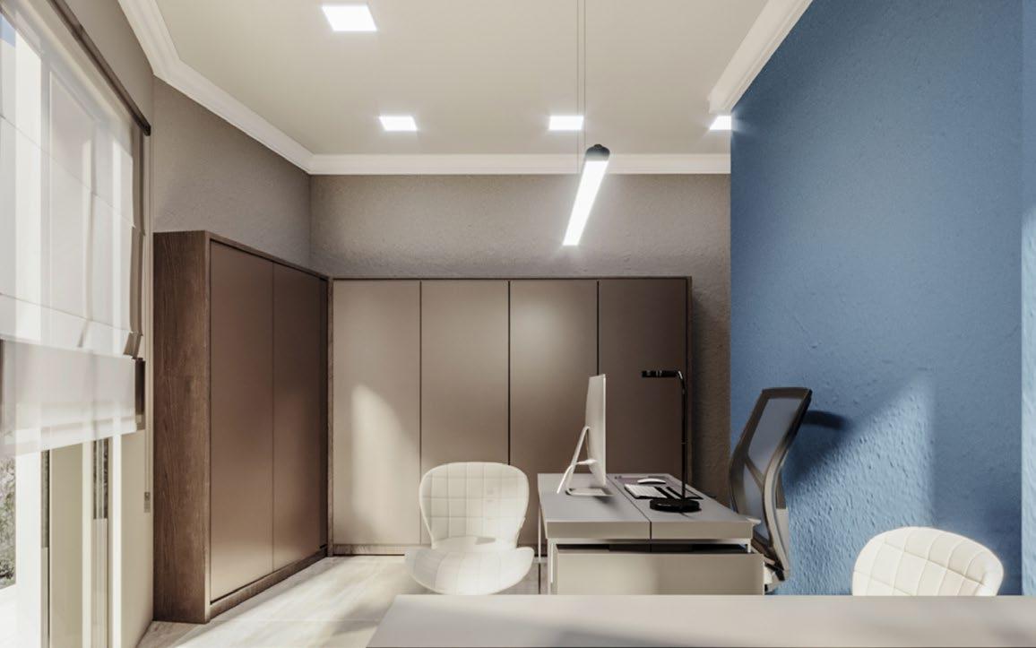 La palette de couleurs – bleu, gris et beige – instaure une ambiance à la fois apaisante et raffinée. Le bleu, synonyme de sérénité et de concentration, est associé au gris pour une touche contemporaine et au beige pour un rendu plus chaleureux. Ces nuances sont mises en valeur par l’intégration du bois, qui apporte une touche naturelle et élégante à l’ensemble.
