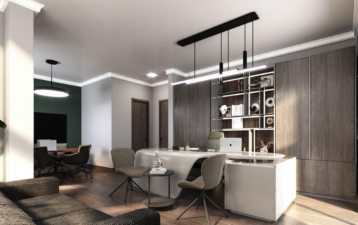 La palette de couleurs – vert olive, gris foncé et gris clair – apporte une atmosphère à la fois apaisante et sophistiquée, idéale pour un cadre de travail équilibré. Ces nuances sont mises en valeur par l’intégration du bois, qui apporte une touche chaleureuse et naturelle à l’espace. Utilisé pour le mobilier, les revêtements ou certains éléments décoratifs, ce matériau crée un contraste subtil avec les tonalités froides et renforce l’élégance du design.