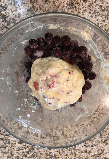 4. Once mixed together, add your frozen blueberries. I fold them into the dough by using my clean hands. I mix the dough with my hands until the blueberries are throughout the dough.