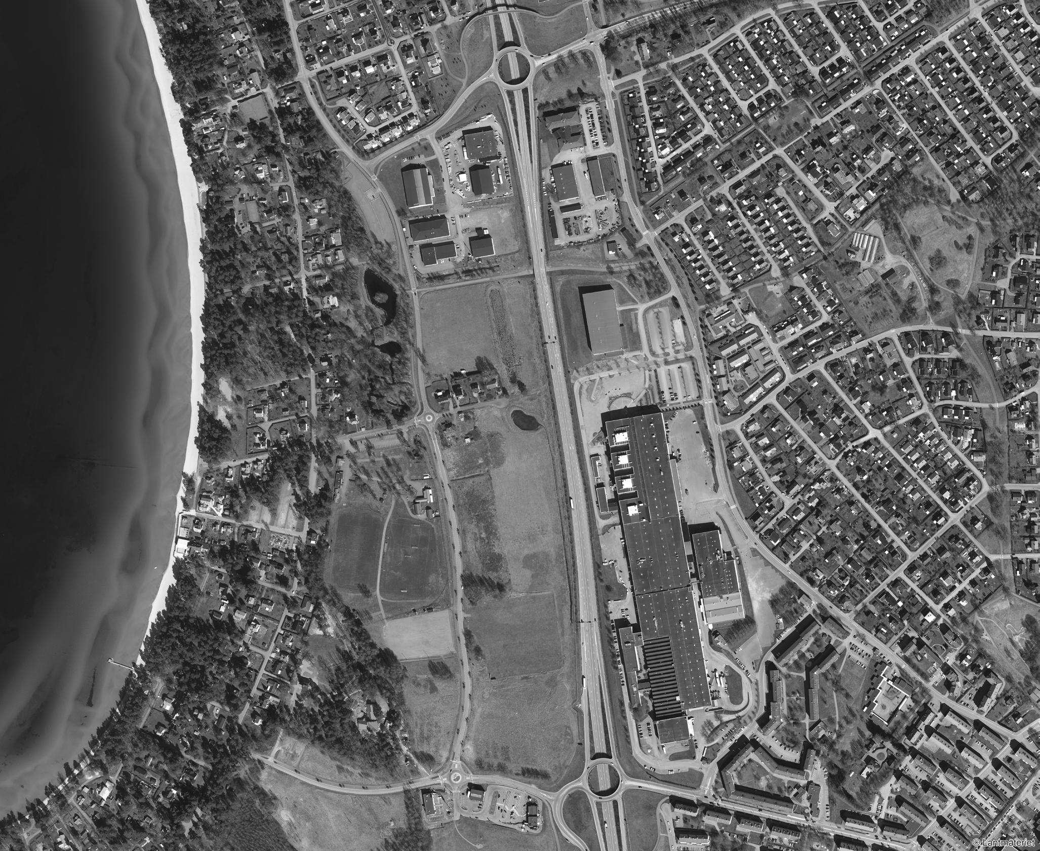 Utblickspunkt 6: från väster Kommande västerifrån på Badstrandvägen mot Motala Centrum upplever man övergången från de skogsdominerade områdena med småskalig infrastruktur och bebyggelse till ett tätbebyggd område, som domineras av storskalig bebyggelse och infrastruktur. Den nya ishallen passar in i sammanhanget vid trafikplatsen. Upplevelsen av öppenhet och storlek i landskapet åt