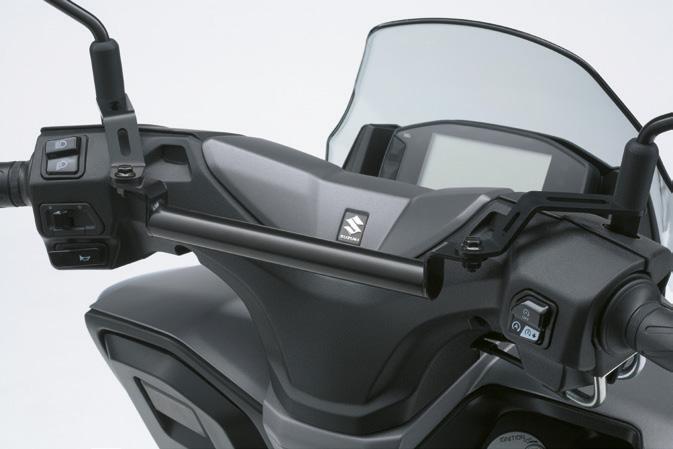 equipamento de série na BURGMAN STREET 125EX. A pega de mãos integrada oferece ao passageiro um bom suporte para maior conforto e segurança. O porta-bagagens* é prático para transportar carga adicional ou para montar a top case, opcional na lista de acessórios originais.