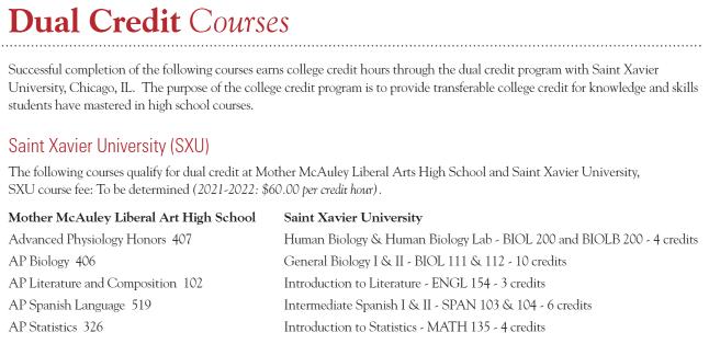 If you have any questions regarding the Dual Credit Program, please contact our Assistant Principal of Academics, Ms. Sandra Smycz, at ssmyczl@mothermcauley.org.