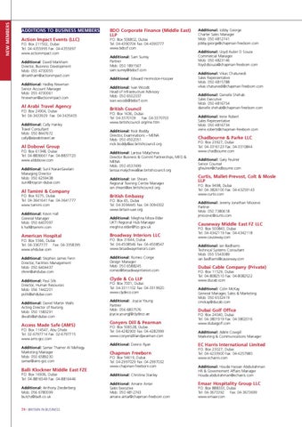 ADDITIONS TO BUSINESS MEMBERS Action Impact Events (LLC) P.O. Box 211502, Dubai Tel: 04-4355995 Fax: 04-4355997 www.actionimpact.com Additional: David Markham Director, Business Development Mob: 055 4730055 dmarkham@actionimpact.com Additional: Hadley Newman Senior Account Manager Mob: 055 4730061 hnewman@actionimpact.com