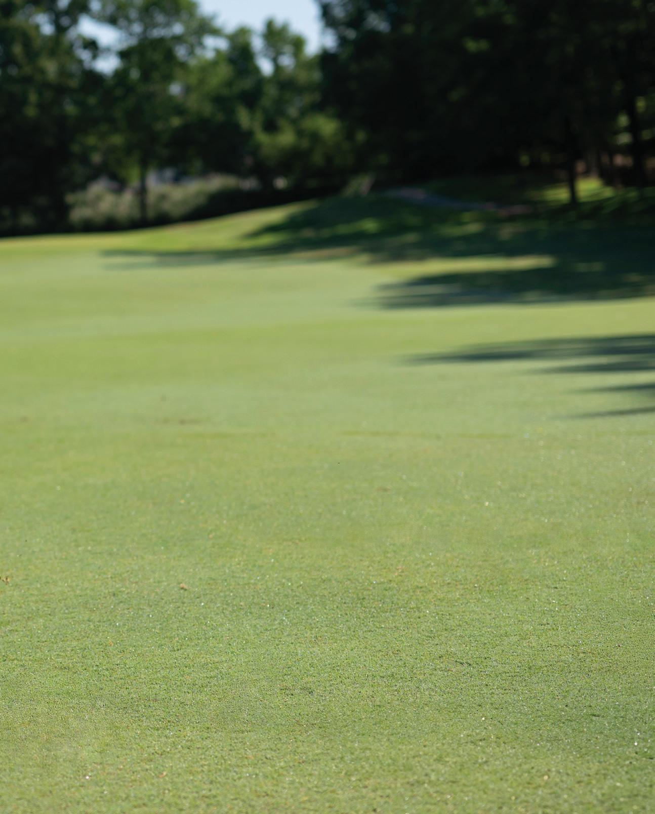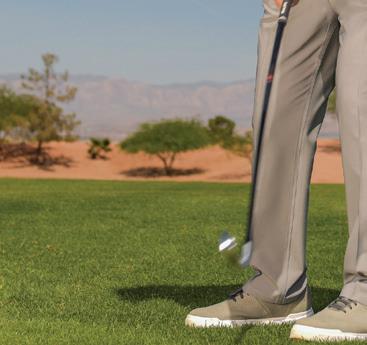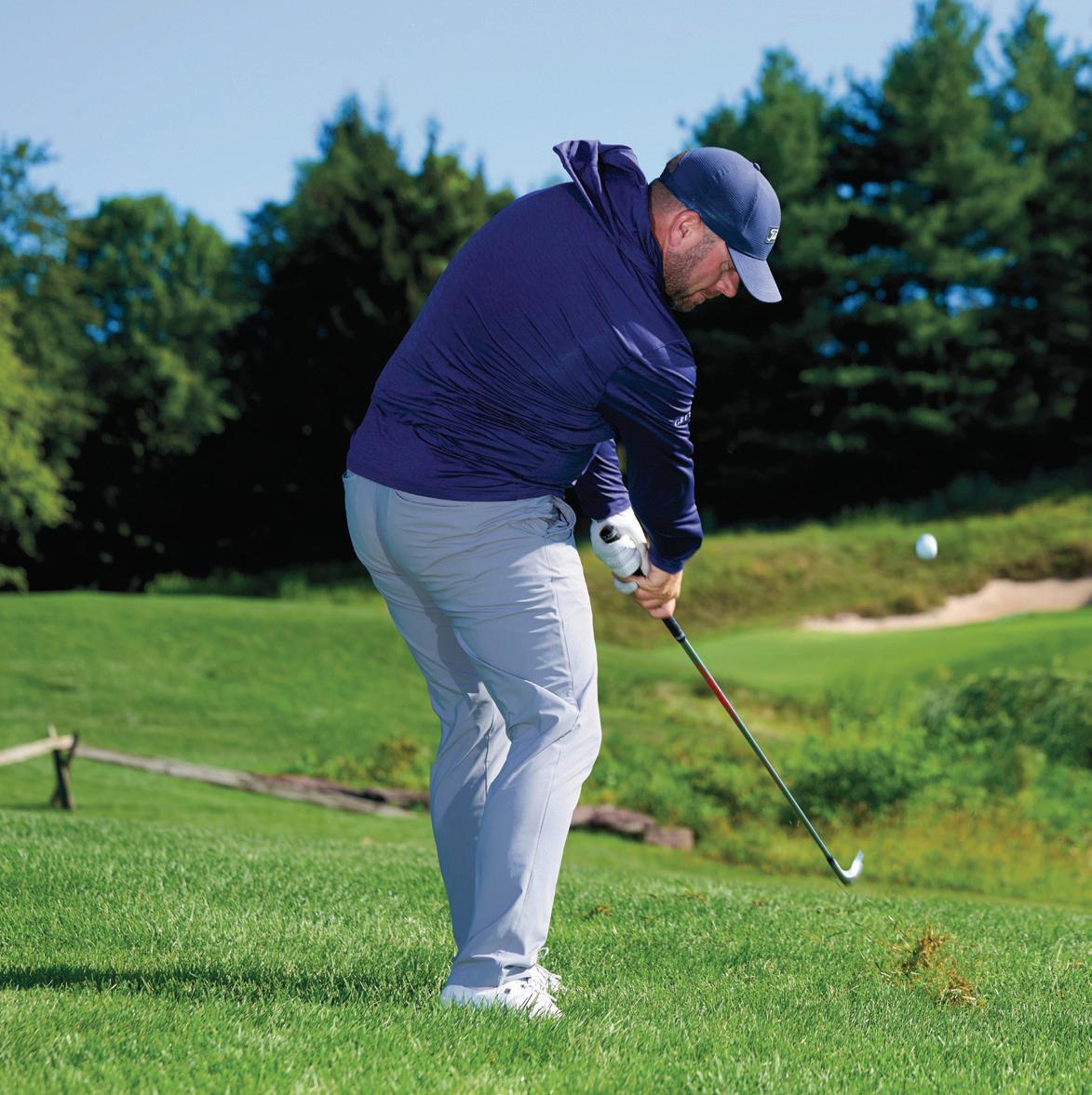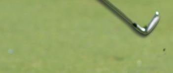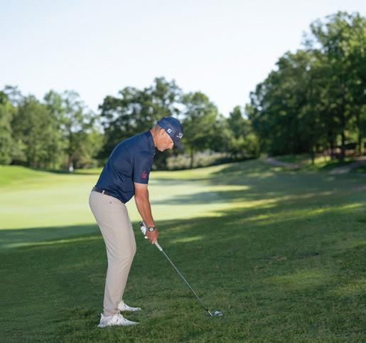 grip down and put 70 percent of your weight on your lead leg (opposite page). From this setup, the club will tend to swing slightly to the outside going back (far right), which sets up a steeper downswing. Feel like the clubhead drops straight down on the ball. The last thing you want from the rough is a sweeping motion through impact. Also, because the ball tends to spin less from the rough, pros often take less club to play for rollout. If you’re 150 yards from the hole, you might need to carry the ball only 130 to get it pin-high. Club down accordingly.