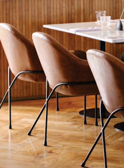Previous pages – A rare example of Sri Lankan Art Deco, the property has been carefully restored to honour its heritage while embracing contemporary codes; Above – Club-style stools clad in tan leather are framed in clean-lined brushed-metal casing