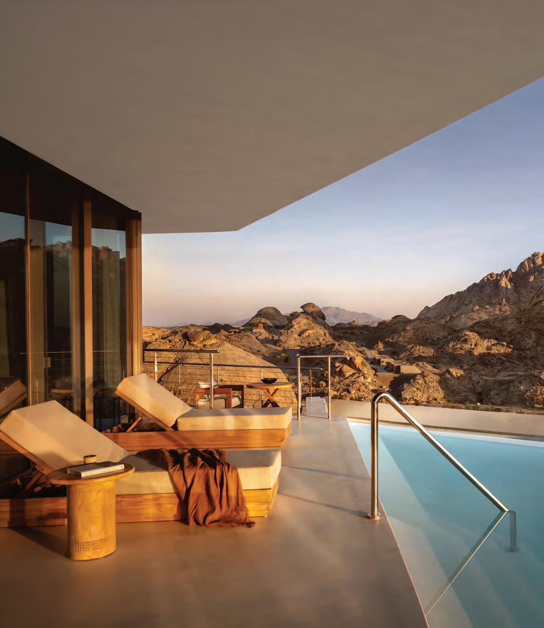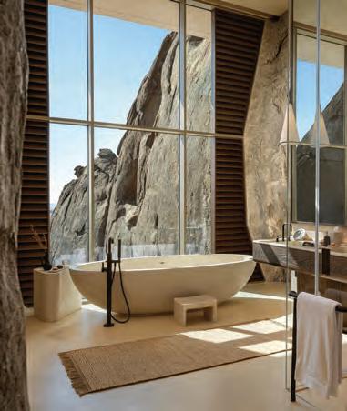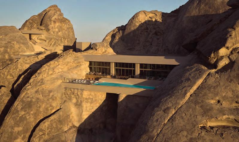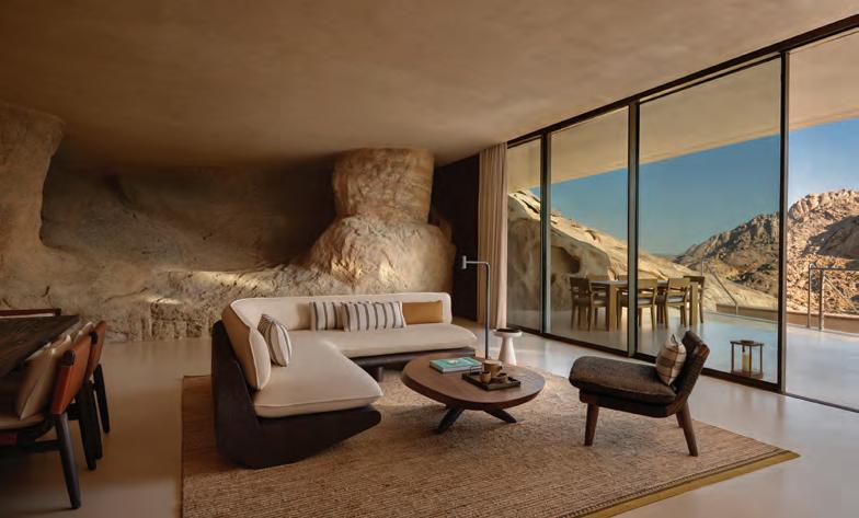 spaces that spill into the landscape; Cliff Hanging Villas, which are suspended high above the valley and offer dramatic perspectives of the surrounding desert; and Mountain Cave Suites and Crevice Villas, which are carved directly into the rock, merging absolute privacy with awe-inspiring views. The piece de resistance is The Royal Villa: hidden in a secluded section of the valley, it offers a bespoke retreat with uninterrupted solitude.