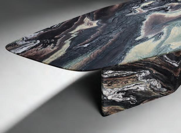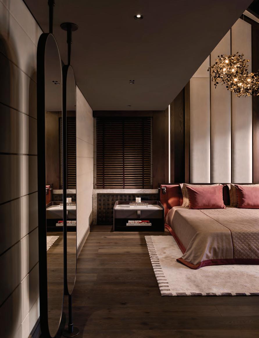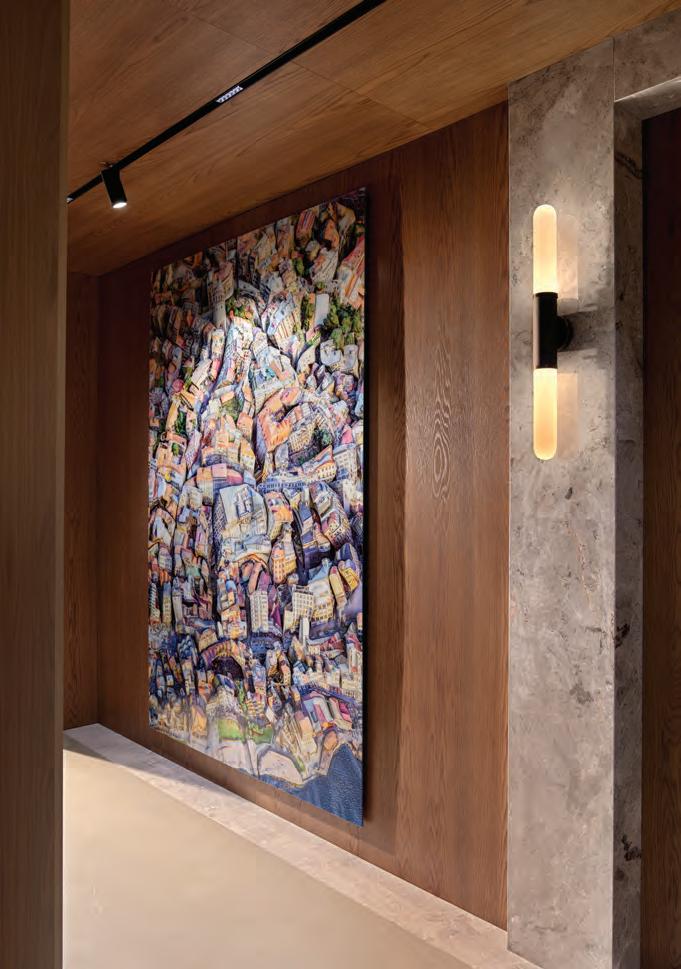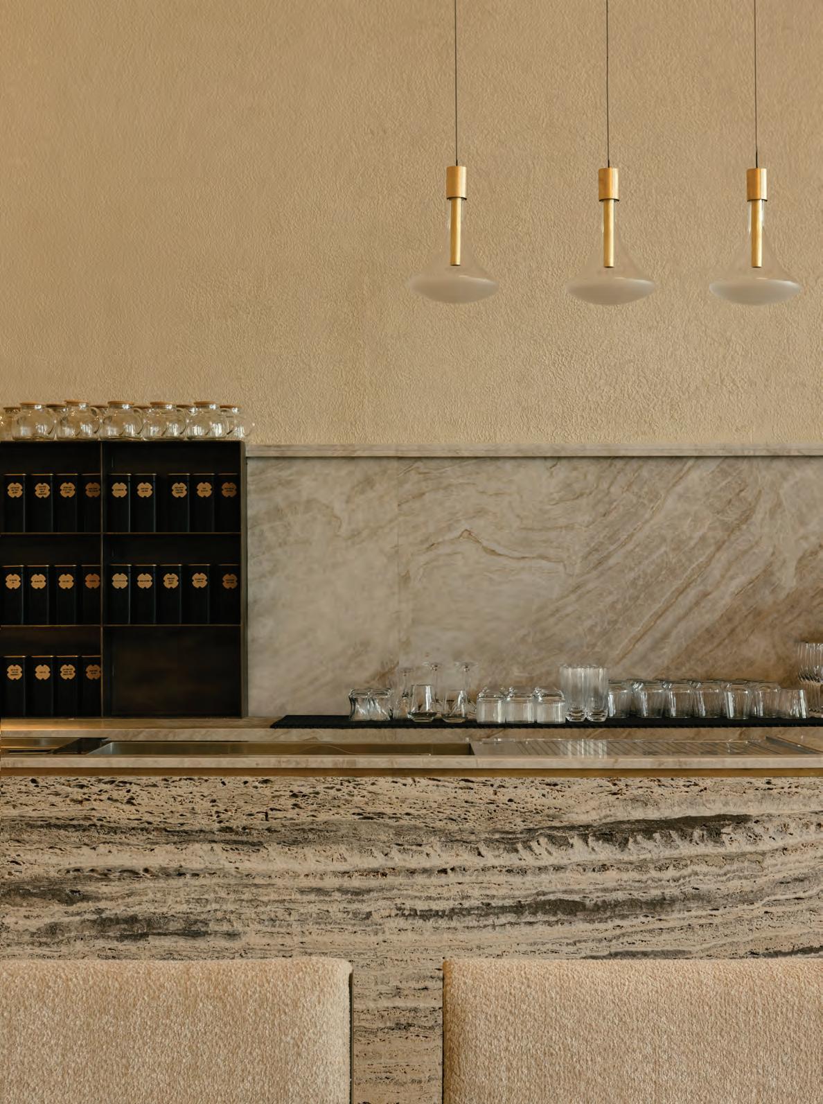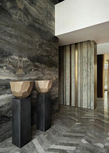 patterns, creating dynamic surface aesthetics. This material versatility allows the same stone to display different colour shades and reflections in a skilful play of light and shadow. The residence greets its guests with an elegant and voluminous wall of Arabescato Orobico, a decorative stone that immediately imparts a lively and precious aesthetic. The nine-metre-high entrance Synua door by Oikos is made with bronze finishes and features an external engineered wood covering.