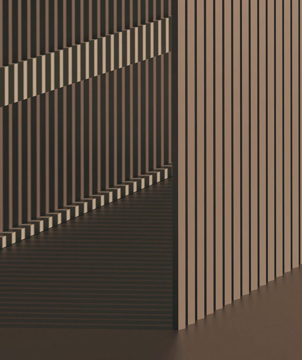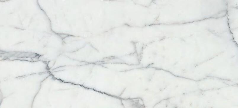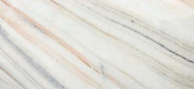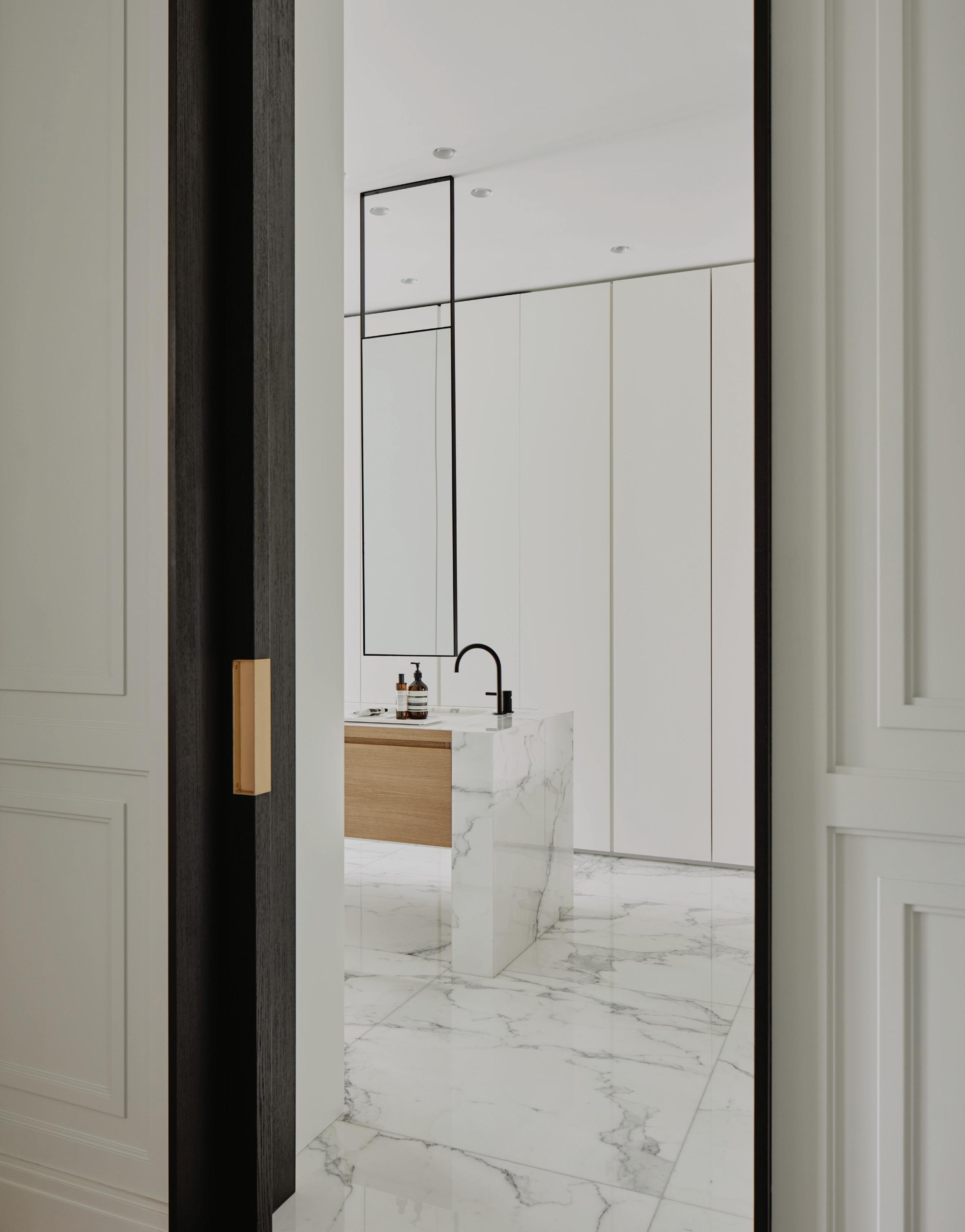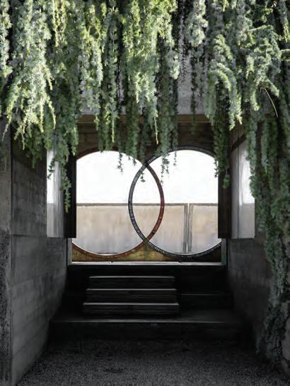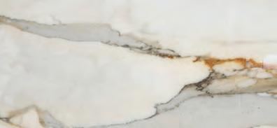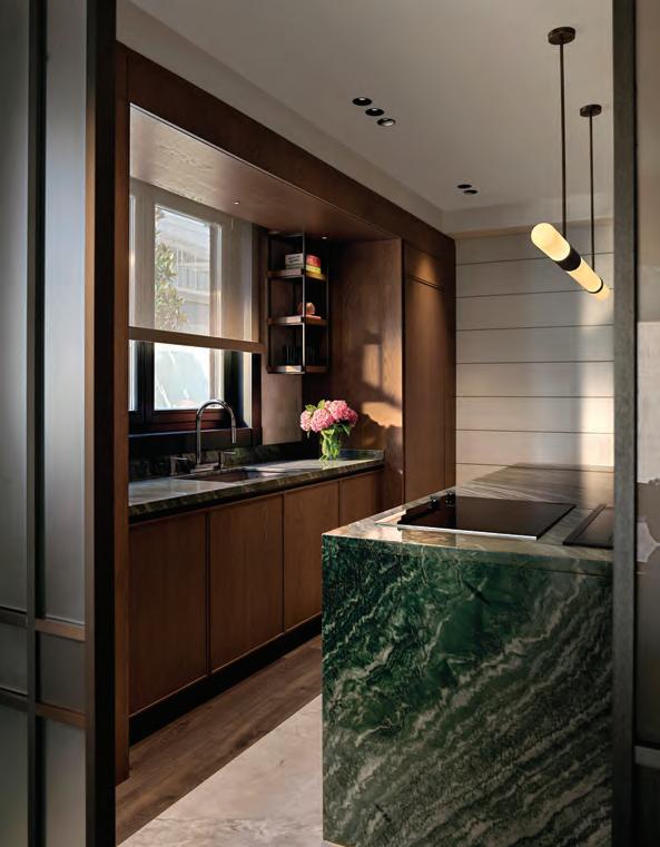 patterns, creating dynamic surface aesthetics. This material versatility allows the same stone to display different colour shades and reflections in a skilful play of light and shadow. The residence greets its guests with an elegant and voluminous wall of Arabescato Orobico, a decorative stone that immediately imparts a lively and precious aesthetic. The nine-metre-high entrance Synua door by Oikos is made with bronze finishes and features an external engineered wood covering.