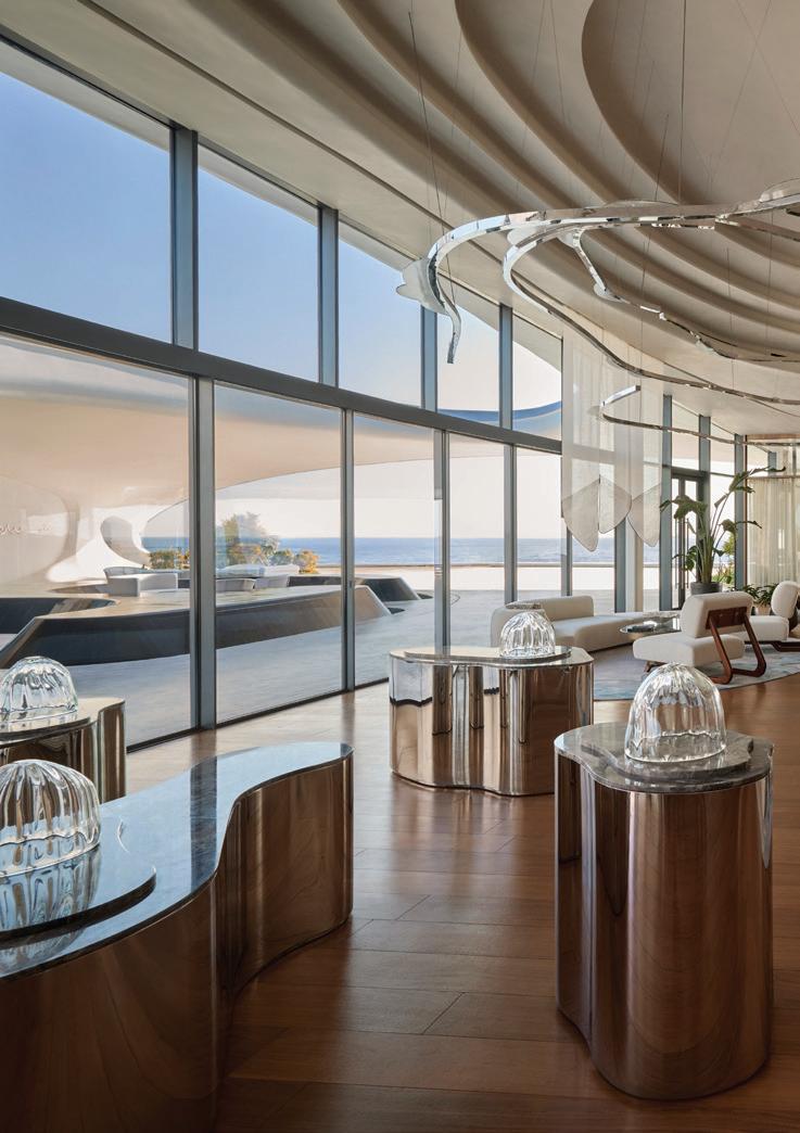 Designed by Studio Paolo Ferrari, Shebara’s interiors embrace a philosophy of ‘Natural Futurism,’ straddling futurism and timelessness. Drawing inspiration from the protective shell of a sea urchin, Ferrari’s team crafted interiors that contrast the orbs’ sleek exteriors with soft, cocooning spaces. The studio leaned into aerodynamics and movement to create soft and tailored interiors. With the sea’s vibrant blues outside, the studio embraced a restrained interior palette, allowing nature to take centre stage. “Our idea is to frame the water, and to let nature be the real focus,” shares Paolo Ferrari, the studio’s founder. Echoing the precision of yacht and aviation design, Shebara’s interiors are meticulously crafted. Curved surfaces necessitated advanced 3D modelling techniques to optimise space and ensure the seamless integration of furnishings. “How we maximise space in a villa like this is similar to how you design a private jet or yacht, where you have to maximise every square inch,” says Ferrari.