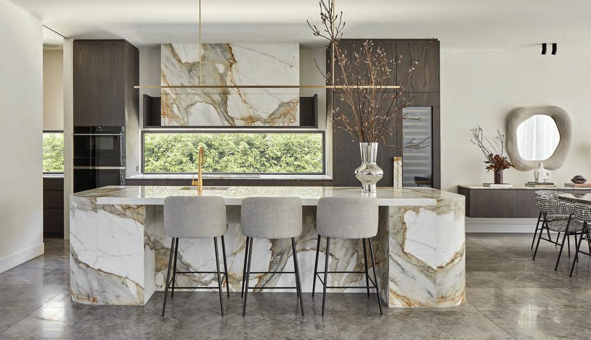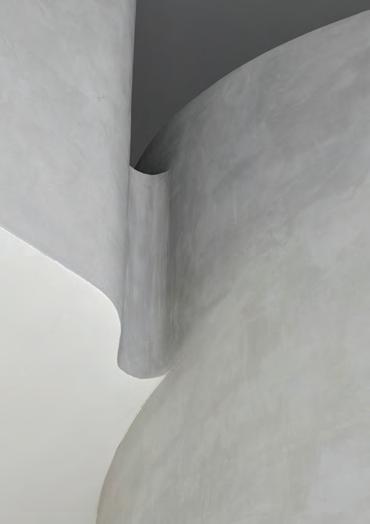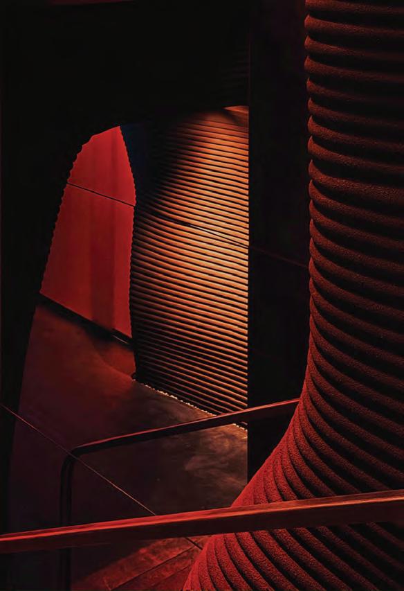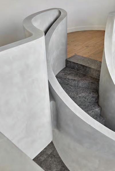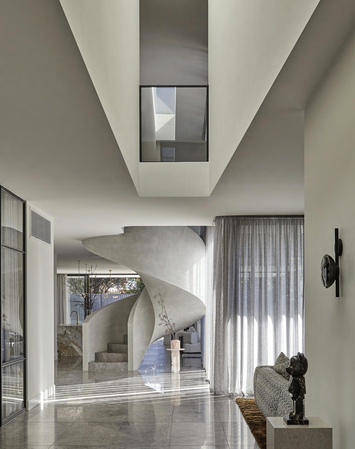 connects large, open areas with more intimate ones. A well-considered series of spaces celebrates the house’s voluminous proportions while creating intimate spaces for rest and relaxation. In the larger, more open areas such as the kitchen island and entry foyer there is a sense of freedom that encourages impromptu meetings or casual gatherings. The kitchen island, a central hub in the heart of the home, acts as the perfect gathering point, while the entry foyer draws one in with its gallery-like openness. At the centre of the living area, a sculptural staircase acts as both a functional and artistic focal point. This stunning staircase not only serves as the connection between the two levels of the home; it also creates a dramatic visual anchor in the space. Positioned centrally within the floor plan, it draws attention and adds a sense of intrigue from the moment a person enters. The design of the staircase is deliberately bold – its clean lines and modern form echoing the exterior’s sculptural aesthetic. The staircase divides yet unites, creating a space that feels expansive and open while still offering pockets of solitude for moments of quiet reflection.