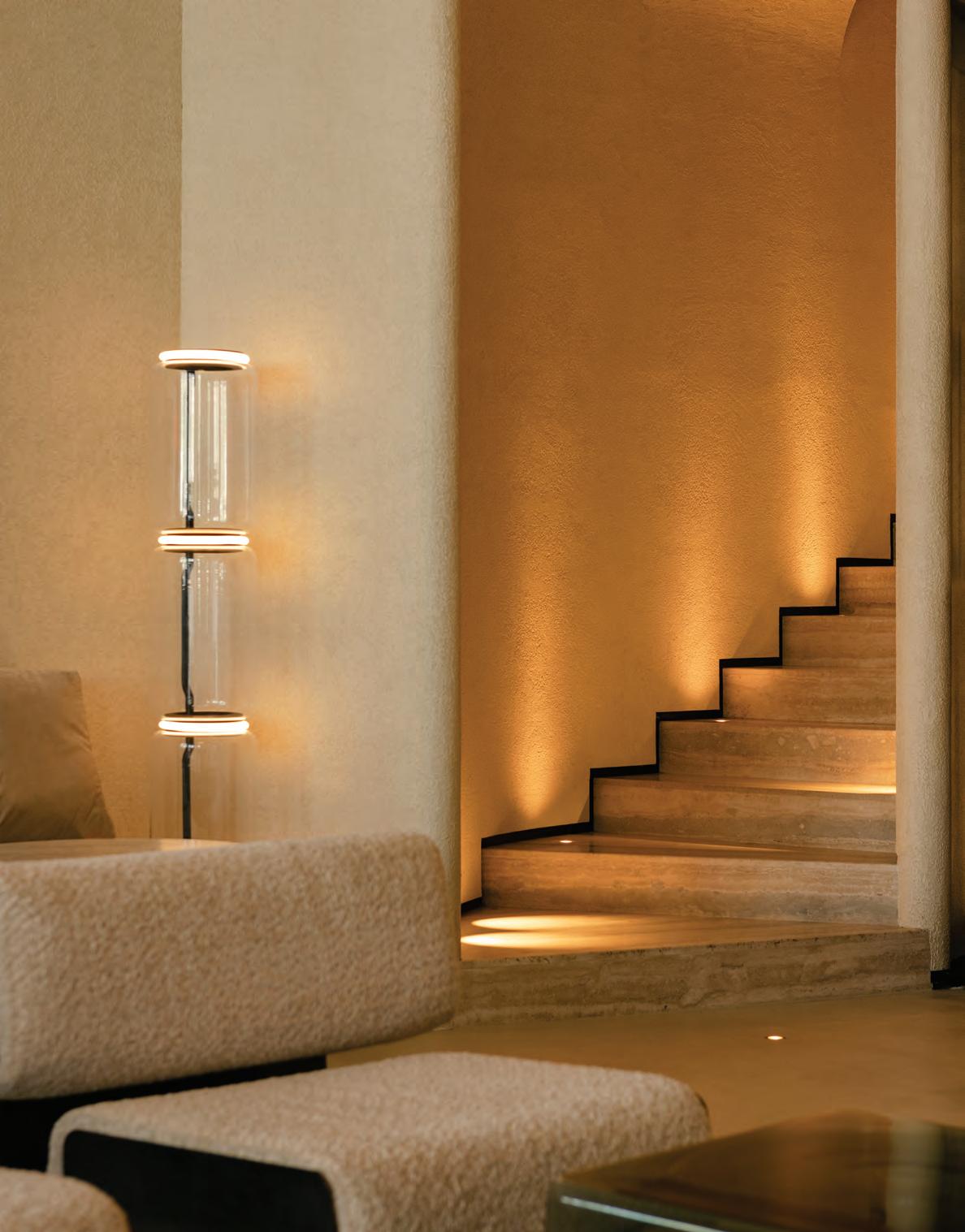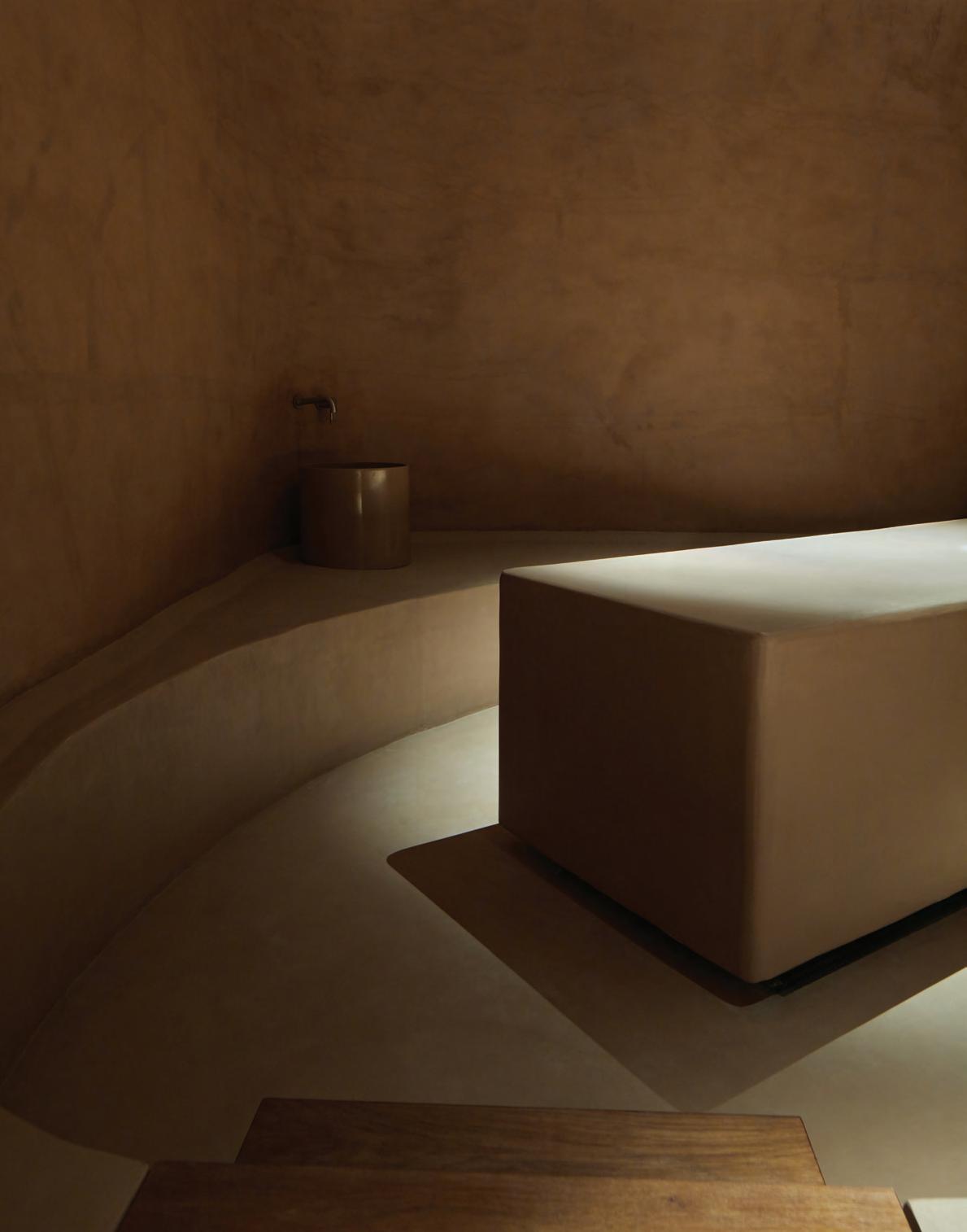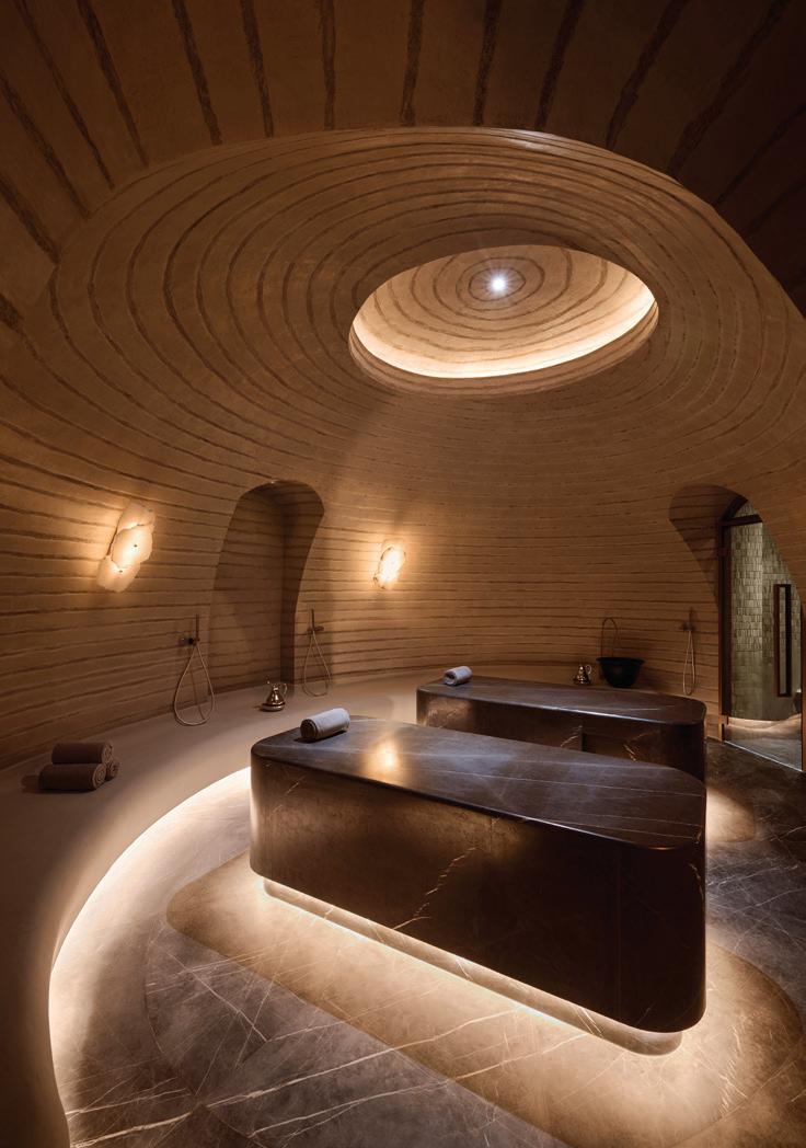 Studio Paolo Ferrari used elemental materials like stone and sand softened by custom-made furniture and lighting reminiscent of torchlight