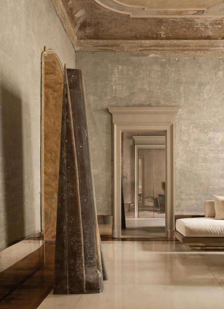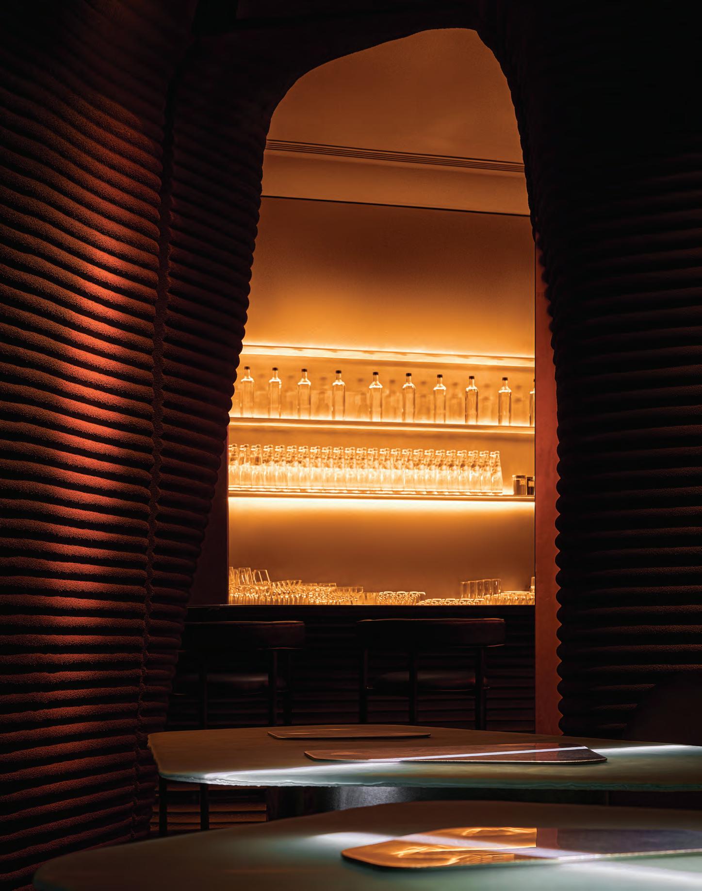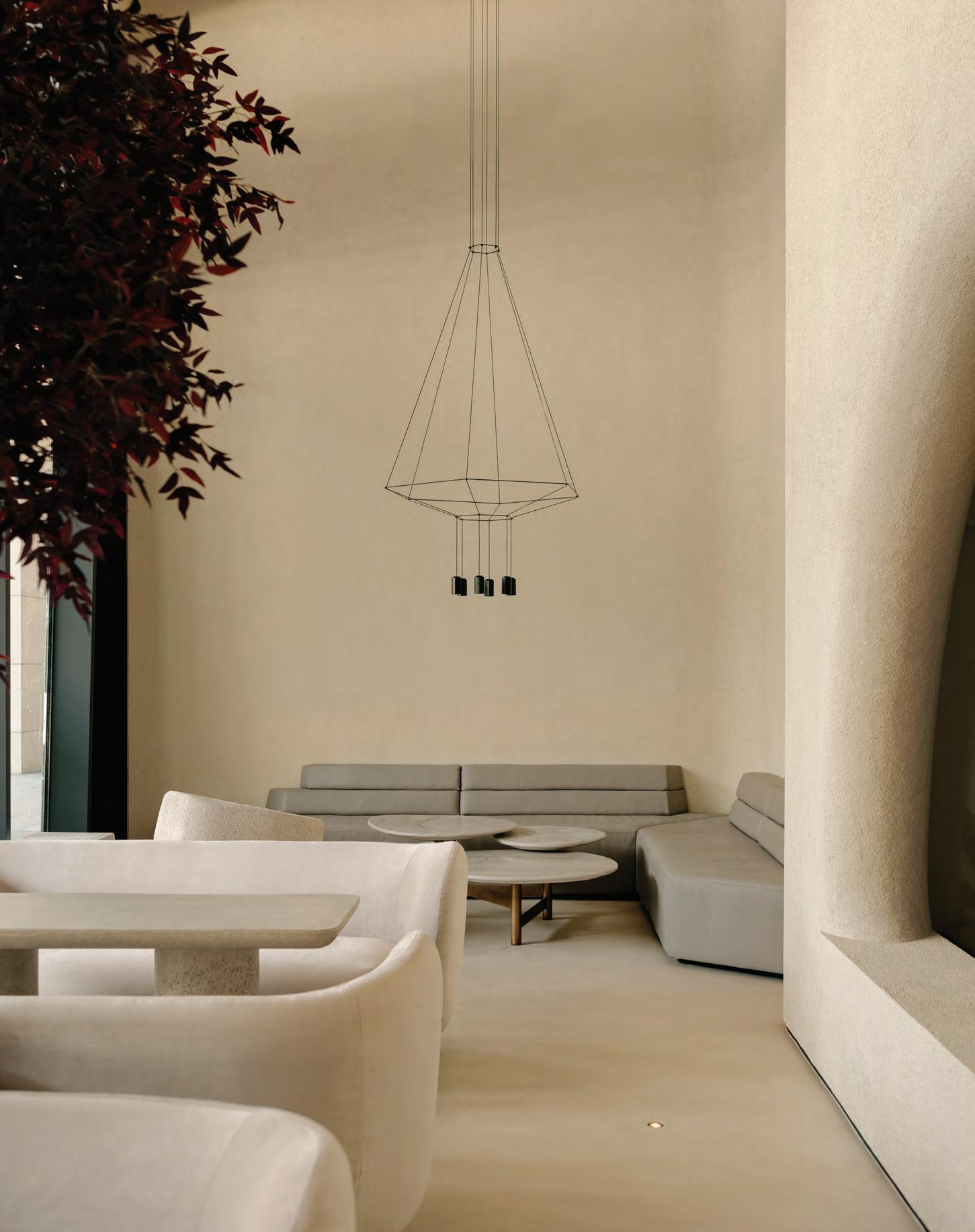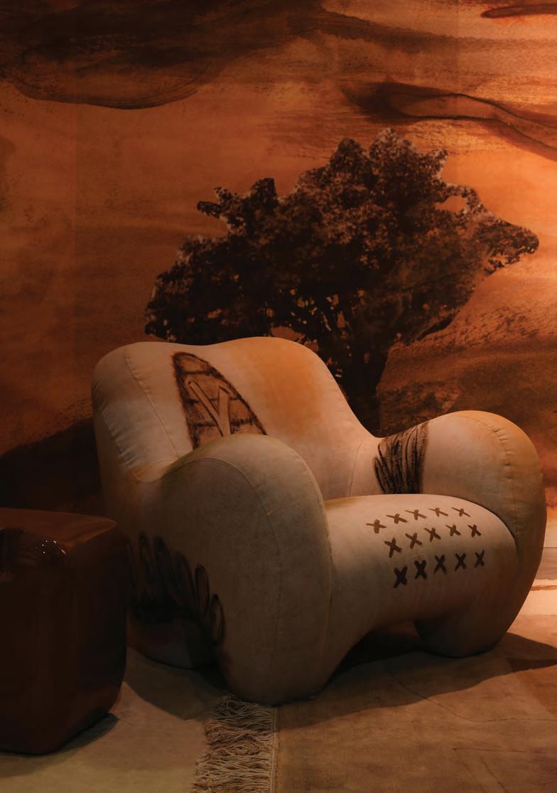 Studio Paolo Ferrari used elemental materials like stone and sand softened by custom-made furniture and lighting reminiscent of torchlight