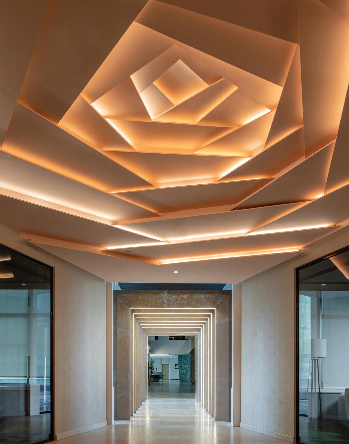 The design’s bold, clean lines and strong presence result in an architectural form that is both modern and timeless. A grey colour palette dominates the interiors, with splashes of black and brown, touched up with gold detailing. A key design philosophy for the project was to enhance the interior experience through spatial innovation. One of the most striking features of the design is the way it effortlessly