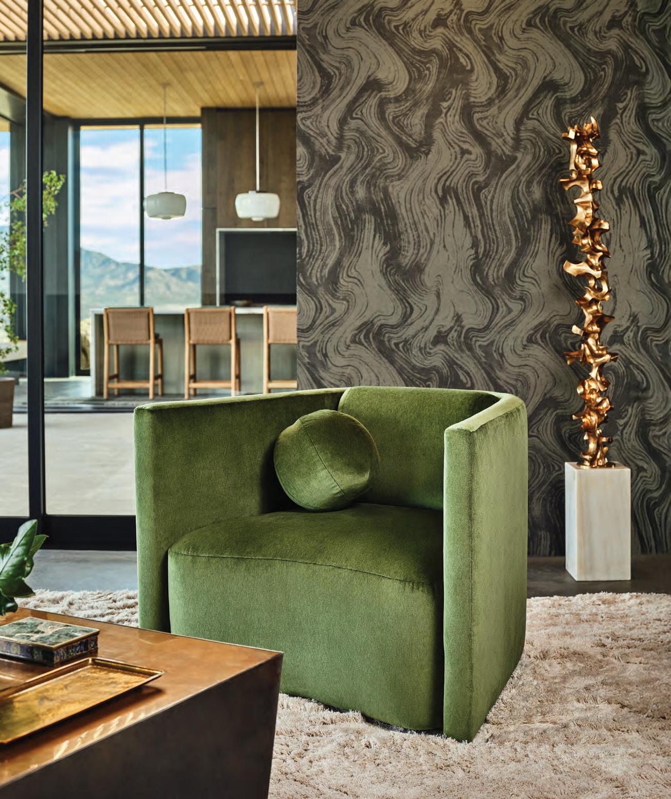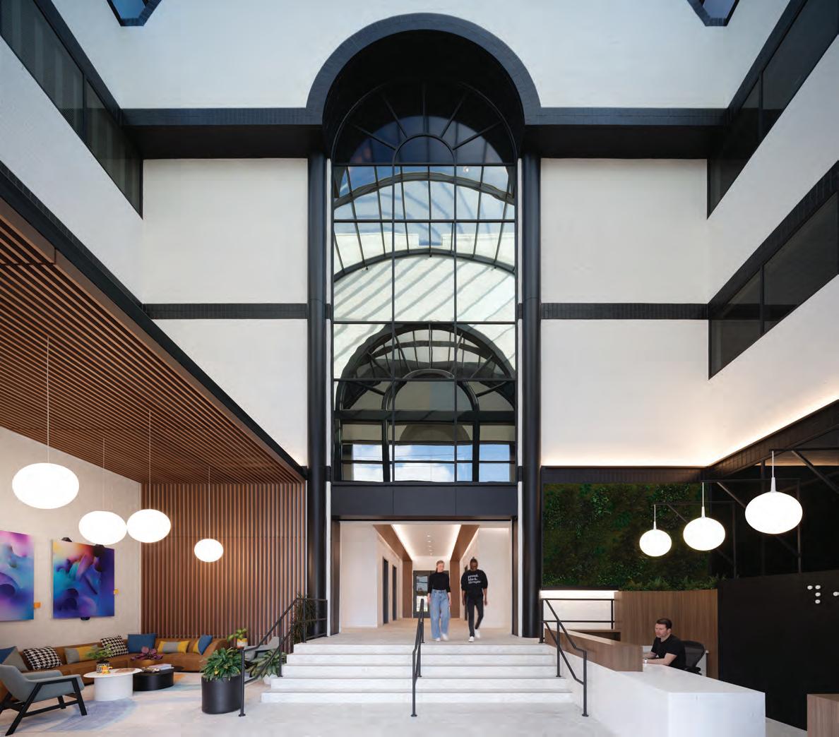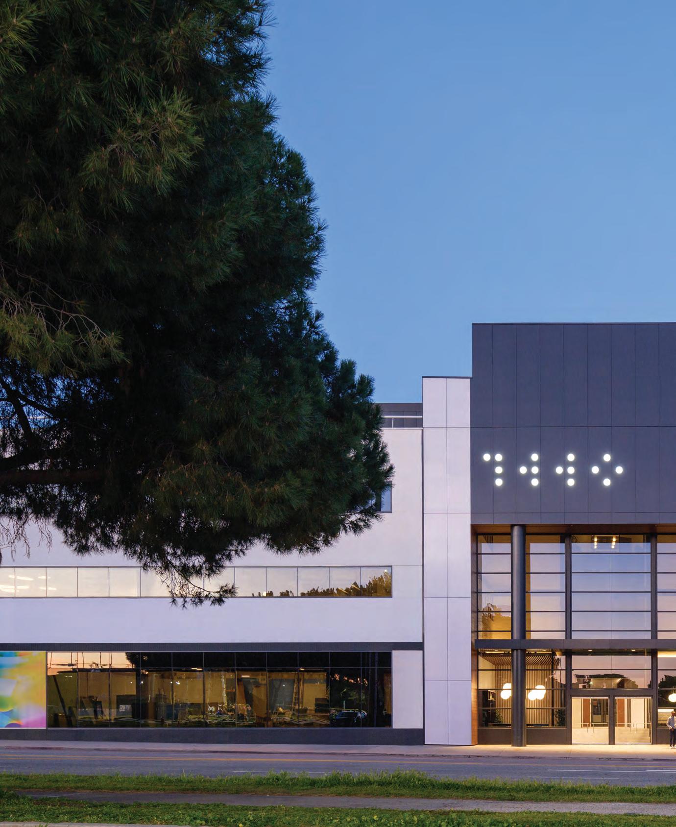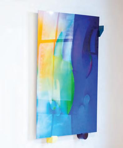 “Near the façade on the Sepulveda Avenue side of the building, there is a beautiful tree that shades the sidewalk and building in the afternoon,” says Kent. “For pedestrians passing on that walkway I wanted to integrate a feeling of cool relief from the sun on a hot summer day, where the tree shades the mural. As a person walks into the dappled light, the mural swirls with gradients of deep blues and wet purple tones, as if they took a dive into a clear, deep ocean.” Inside the 10,000-square-metre building – which is currently home to production studios for a major sports network and spread across three levels – the discovery continues. In the lobby, with its soaring ceilings, a fulllength living wall flanks one side while Kent’s unique work lights up the other, surrounding the space with creative energy from all angles. “There is joy and play in that kind of abstract colour reference tied to bodily movement,” the artist says. “Public art has the capacity to offer solace, delight and transformation. If we give art our attention and curiosity, untold experiences can unfold – new colours are witnessed, a way of seeing discovered, a story transmitted in colour alone might be found. These are just a few of the gifts that I personally have experienced from public art.”