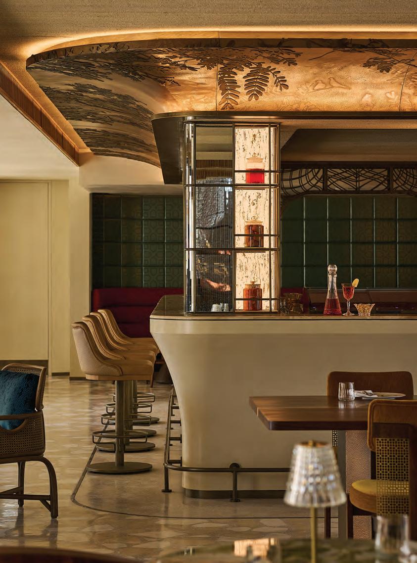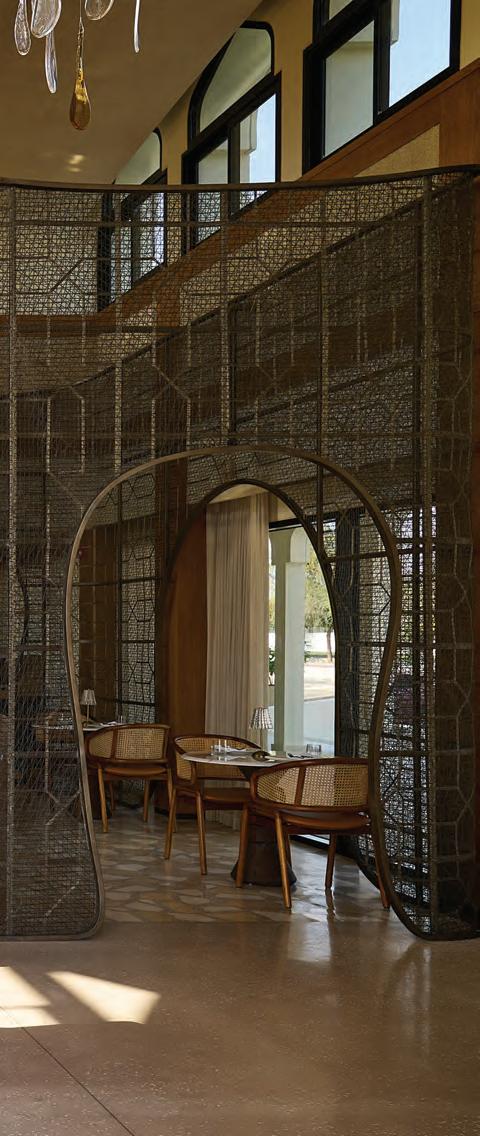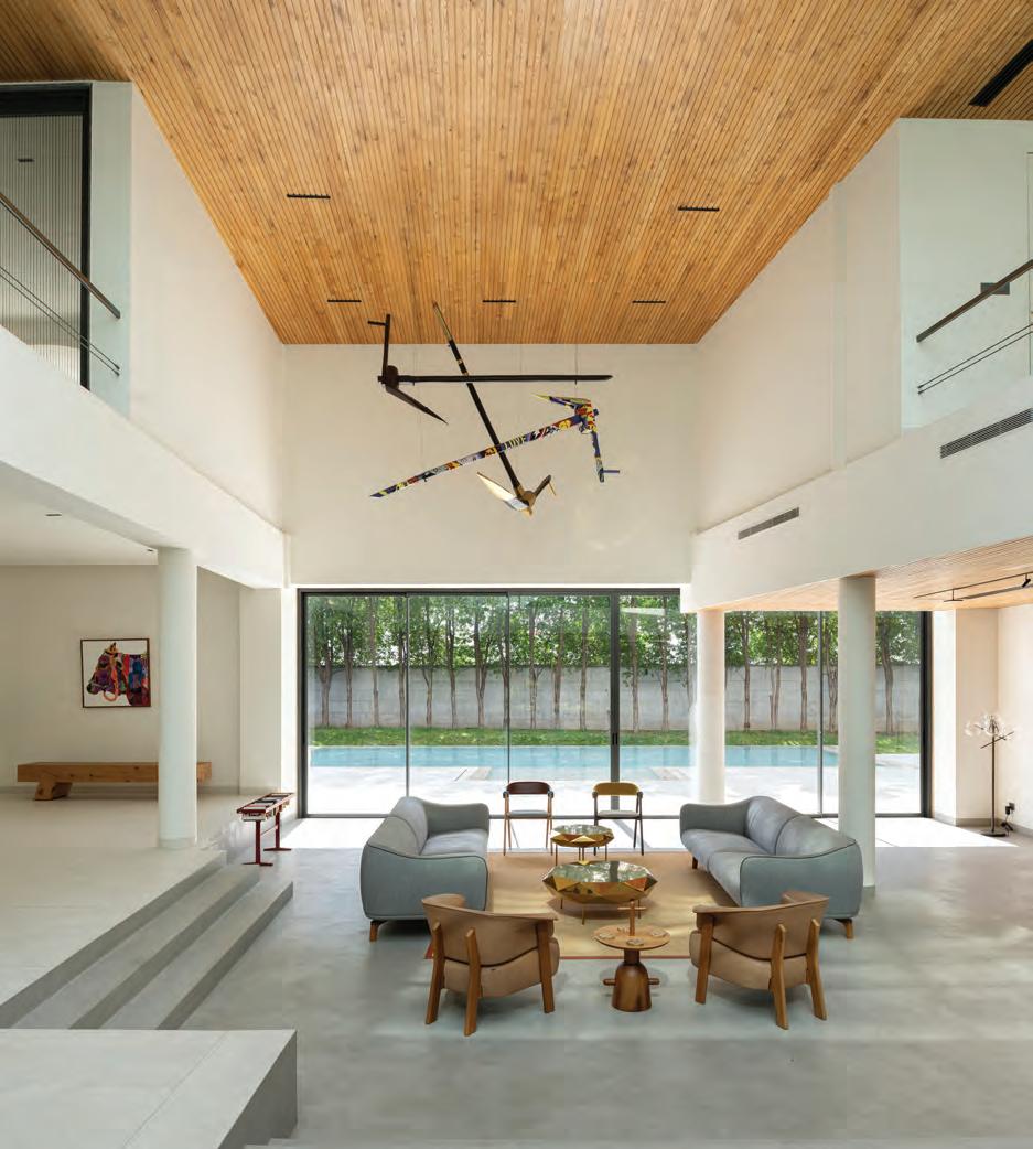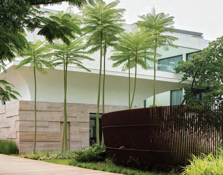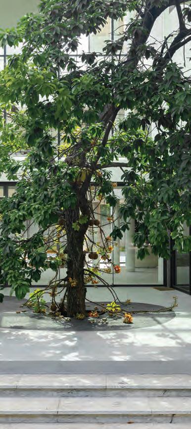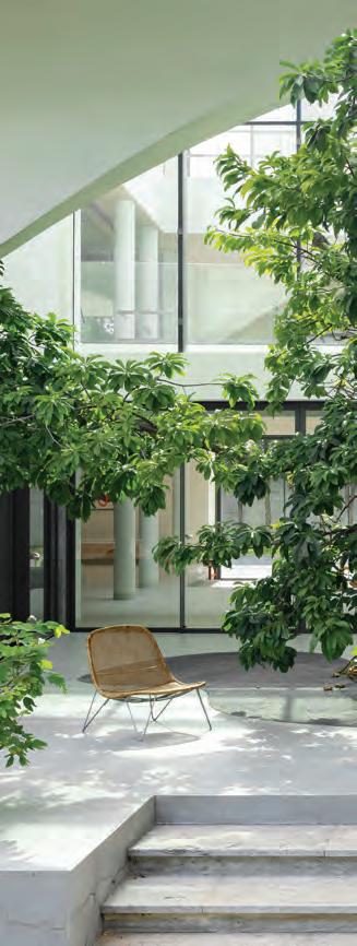 sense of transparency and openness. Situating a courtyard beneath an 80-year-old cannonball tree exemplifies the way in which nature can inspire thoughtful lyrical design. As Lakhamraju elaborates, “This area not only highlights the striking structure of the tree but also creates a serene environment for contemplation and relaxation. The tree’s unique characteristics, including its fragrant flowers and textured bark, add sensory dimensions to the space.”