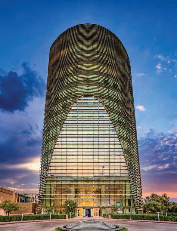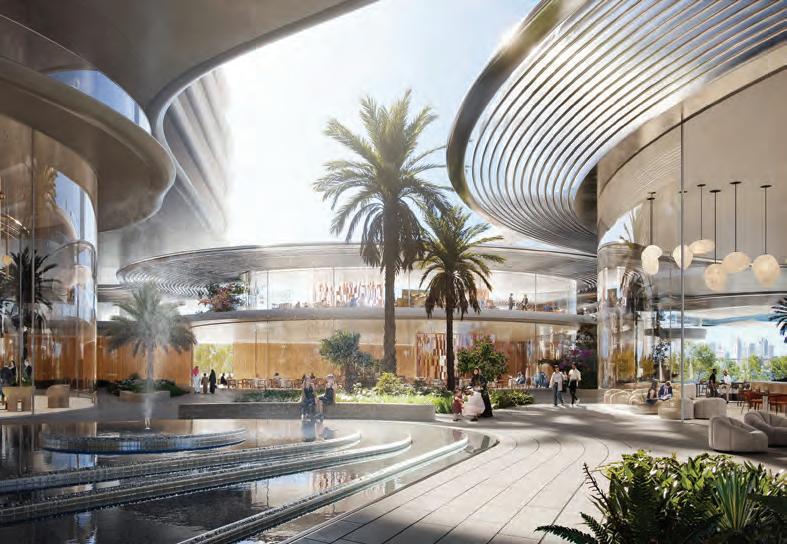 met cafe toward a shaded drop-off that leads to a stately double-height lobby atrium. A podium intersects the composition, concealed within the tower skin. Atop resides the luxurious deck, complete with pools, cabanas, and recreation areas amidst a vegetated oasis. The wellness resort narrative evolves through the expansive spa, fitness complex, and a one-ofa-kind indoor running track.