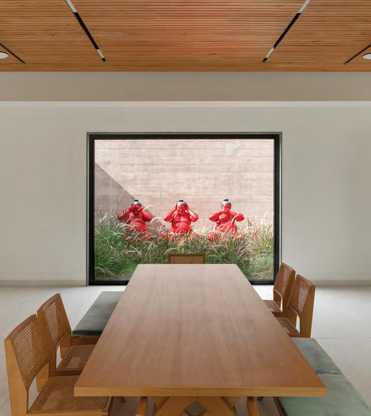 There is a visual harmony between the architecture of the house and its surroundings. Lakhamraju elaborates, “We also embraced the borrowed landscape concept, ensuring that the