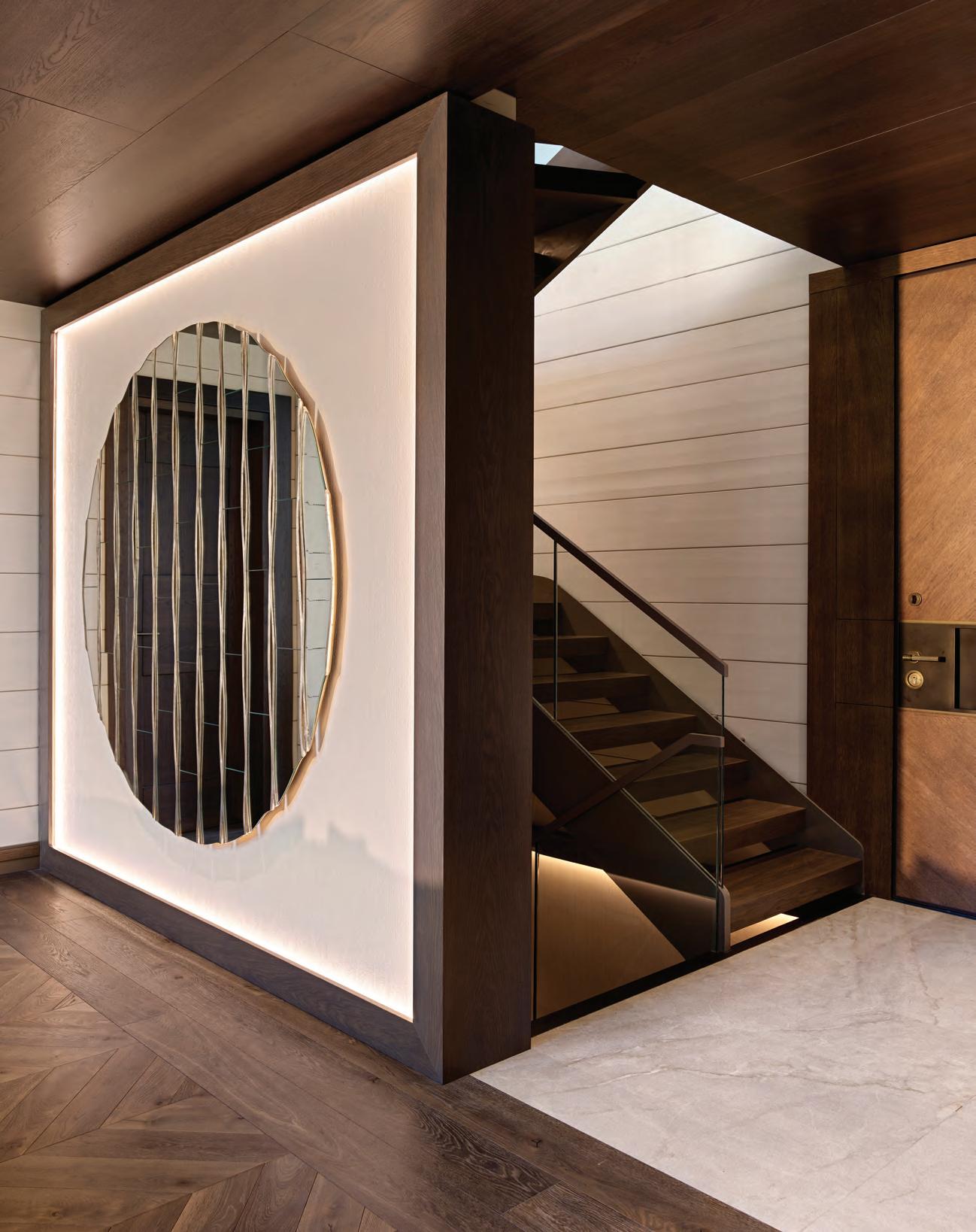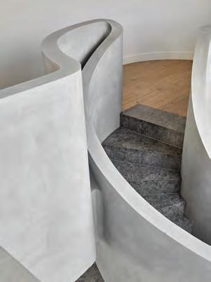 of the villa is the sinuous Fior di Bosco marble staircase, a sculptural stone element, enhanced by handcrafted, on-site modelling.
